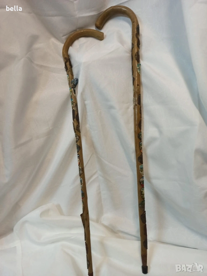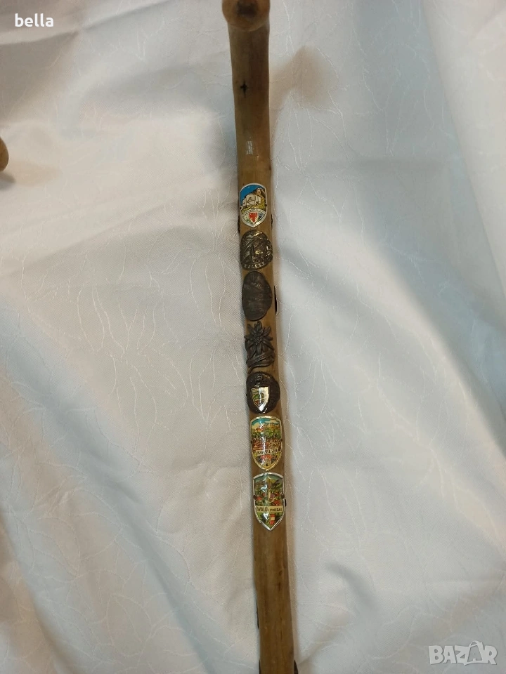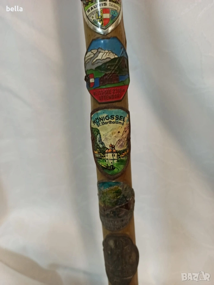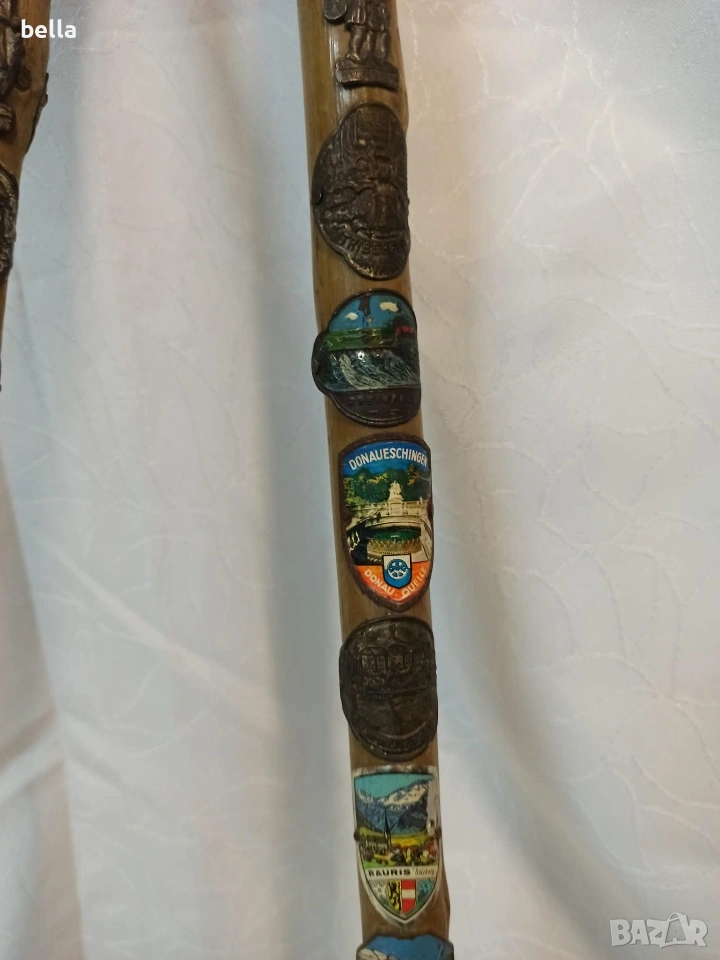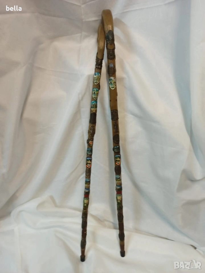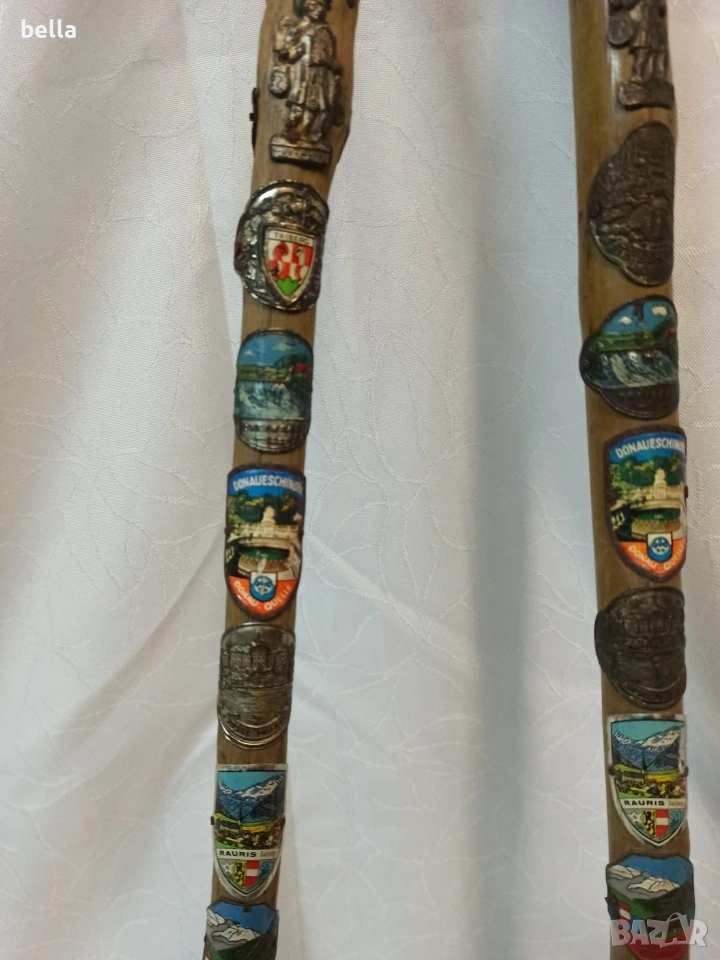 Автентични тиролски алпийски бастуни с колекционерски плакети Два броя автентични алпийски бастуни за планински преходи, ръчна изработка. Всеки бастун е уникален летопис на пътешествия, украсен с множество метални плакети (емблеми) от различни планински върхове, хижи и региони в Алпите. Естествено дърво, лакирано за устойчивост, със запазена автентична извивка на дръжките. Декорация: Множество цветни емайлирани и метални плакети, представящи различни локации и забележителности. Оригинални предпазни накрайници в долната част. Много добро винтидж състояние, напълно функционални или подходящи за битова декорация и колекция.Цена 50 евро за двата