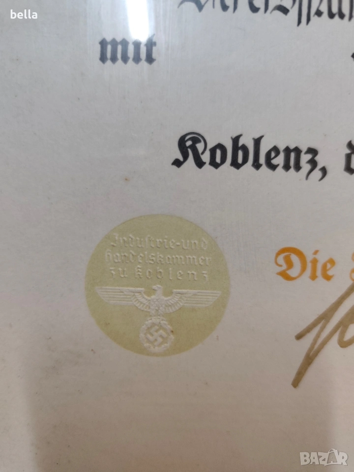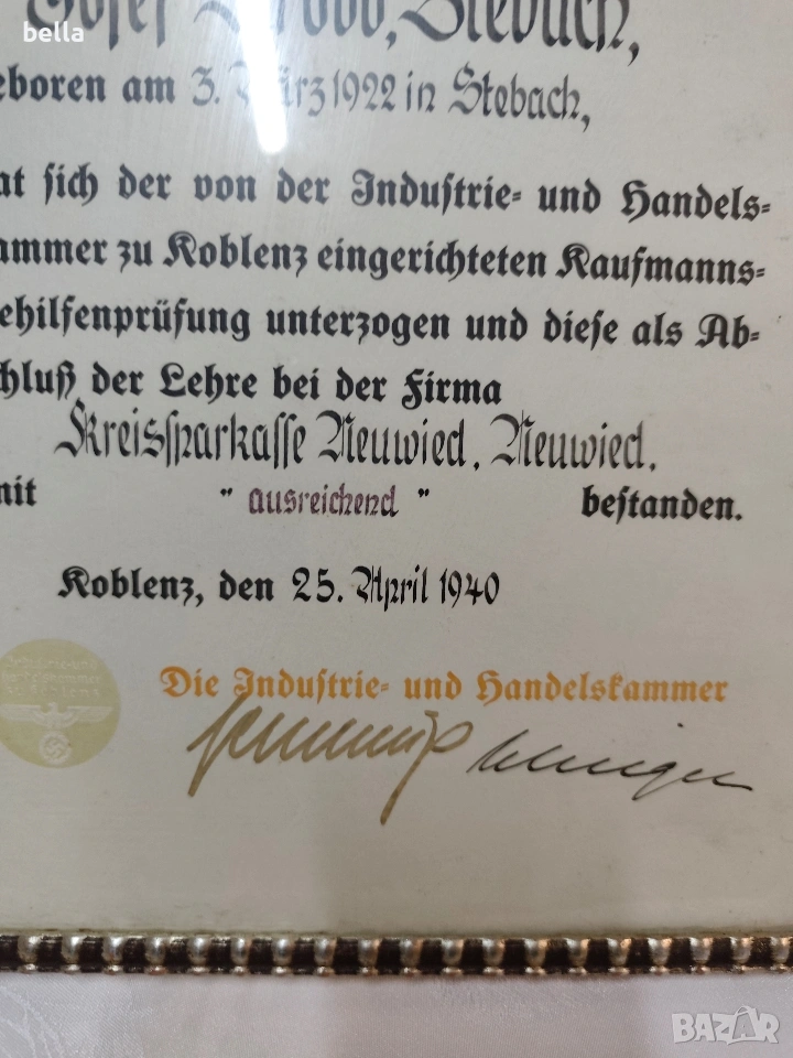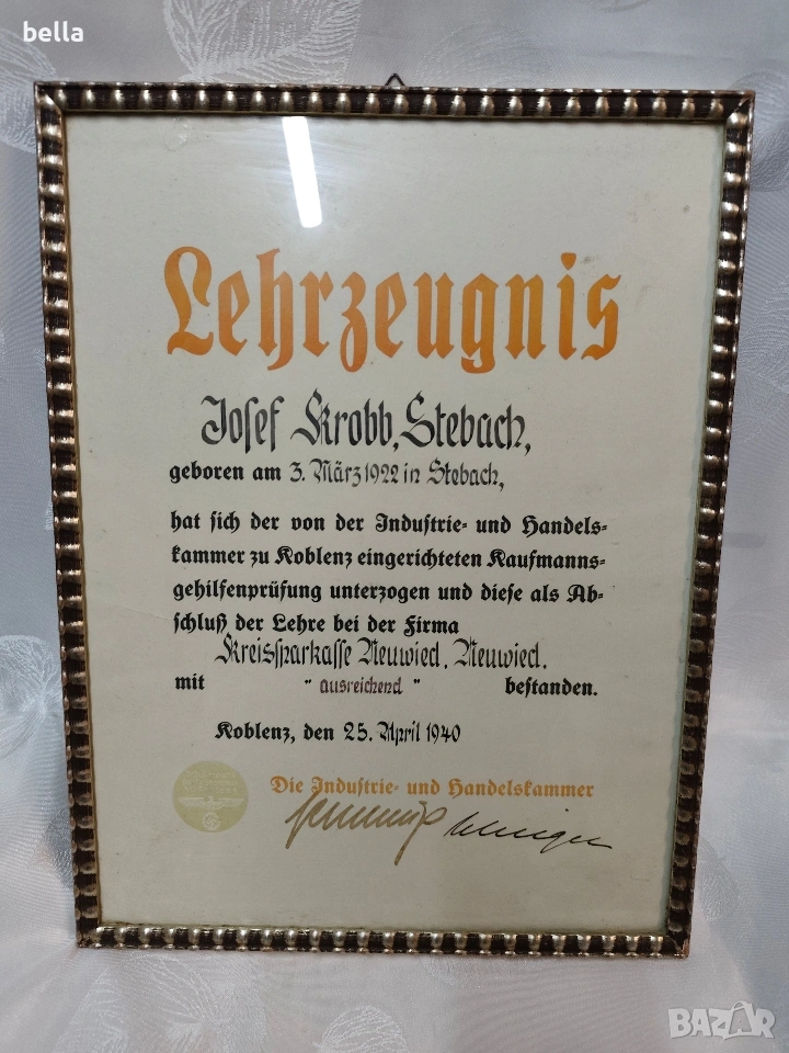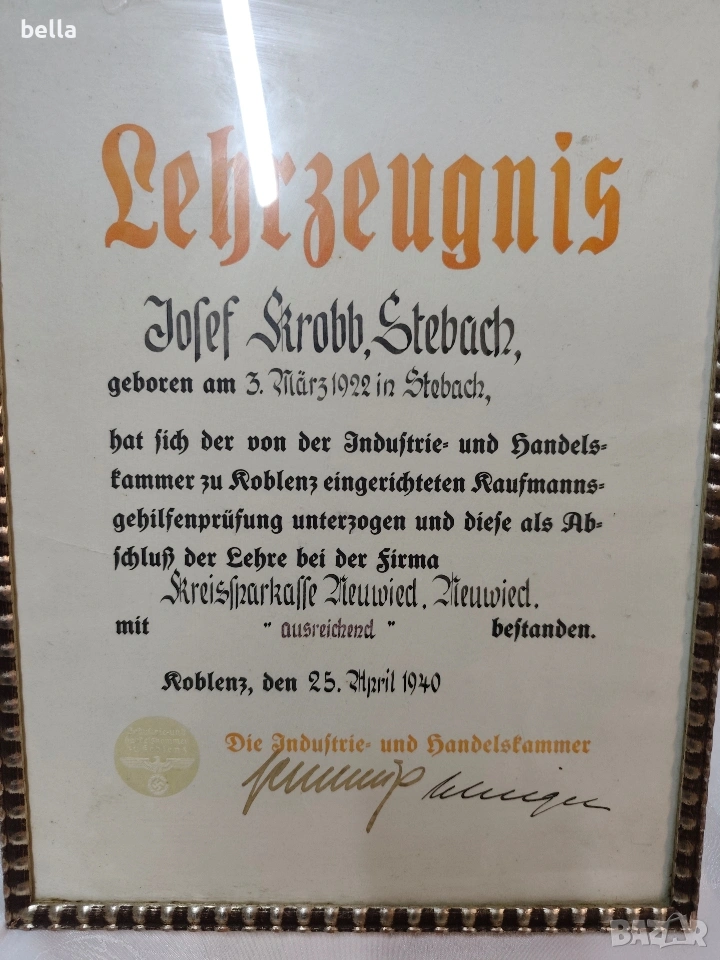 Рядък немски документ от 1940 г. – Свидетелство за обучение с печат Описание: Продавам оригинален германски документ (Lehrzeugnis) от 25.04.1940 г. Издаден на името на Йозеф Скроб за завършено банково обучение в Кобленц. Документът притежава автентичен релефен сух печат от епохата и оригинални подписи. В отлично състояние, рамкиран. Подходящ за исторически колекции и архиви,размери 40/30 см .Цена 50 евро