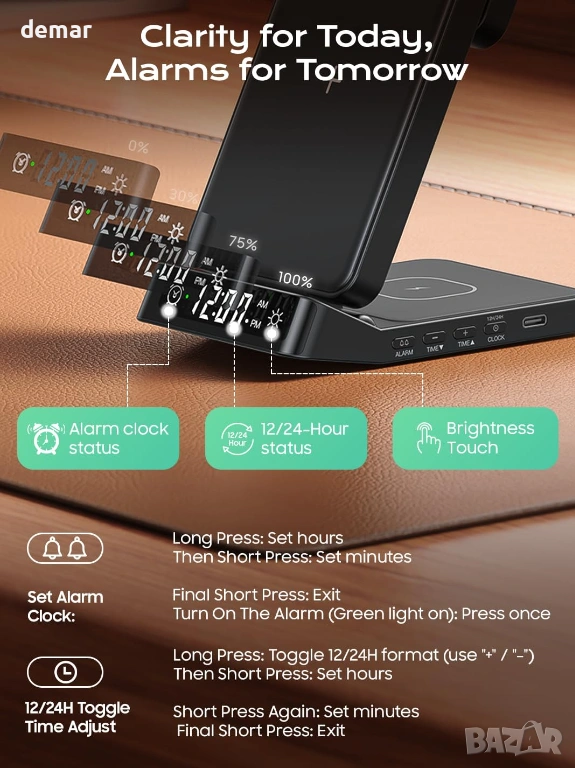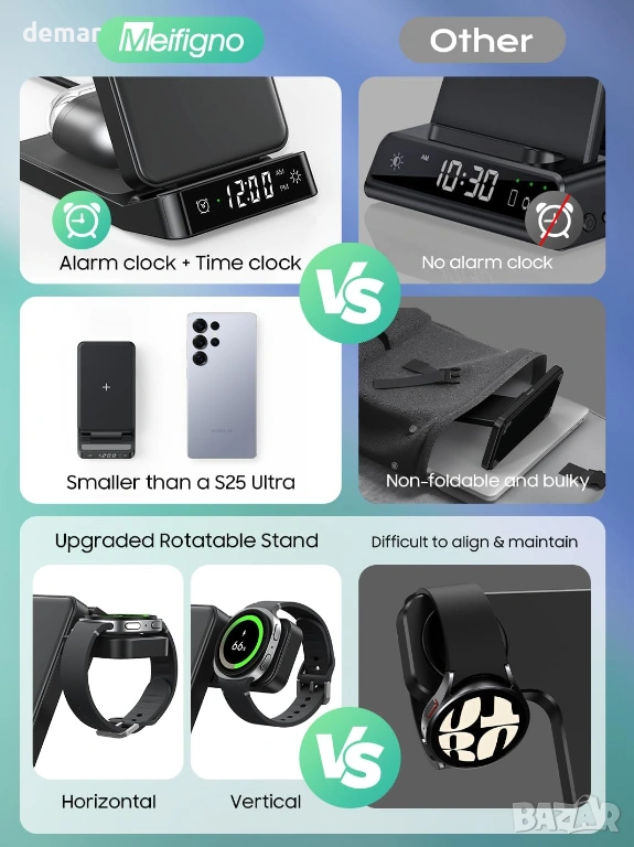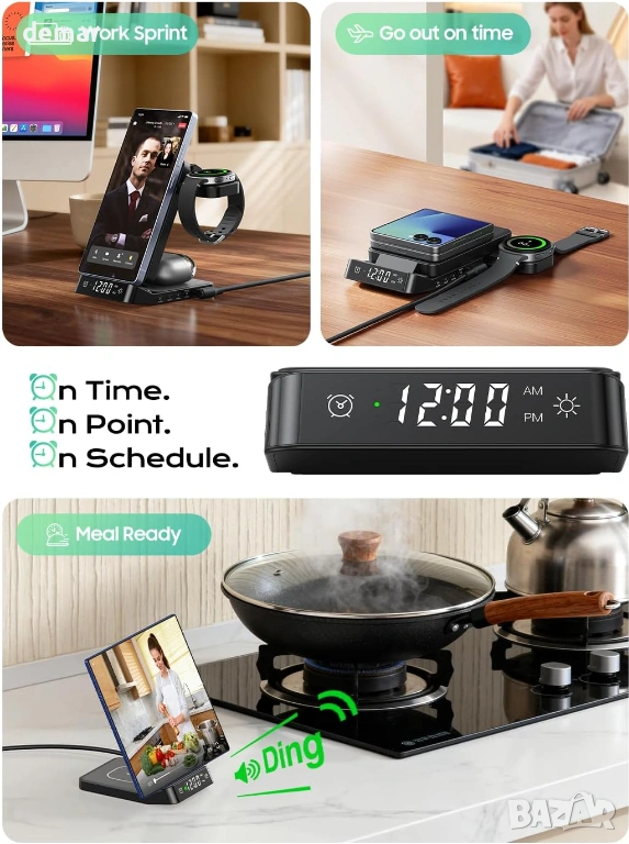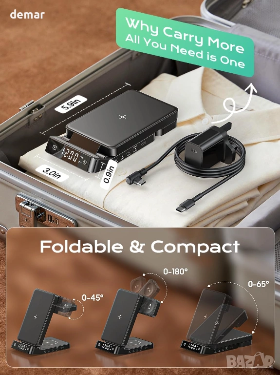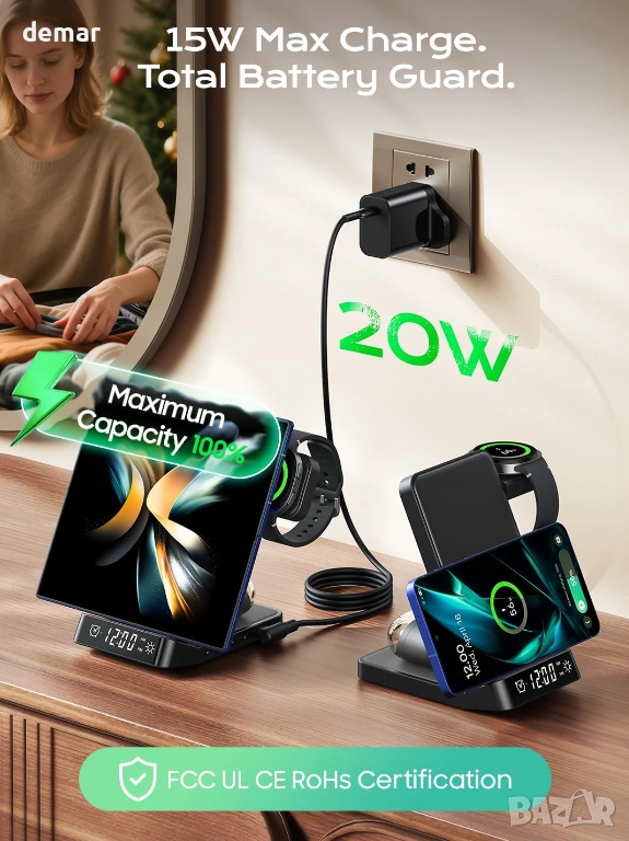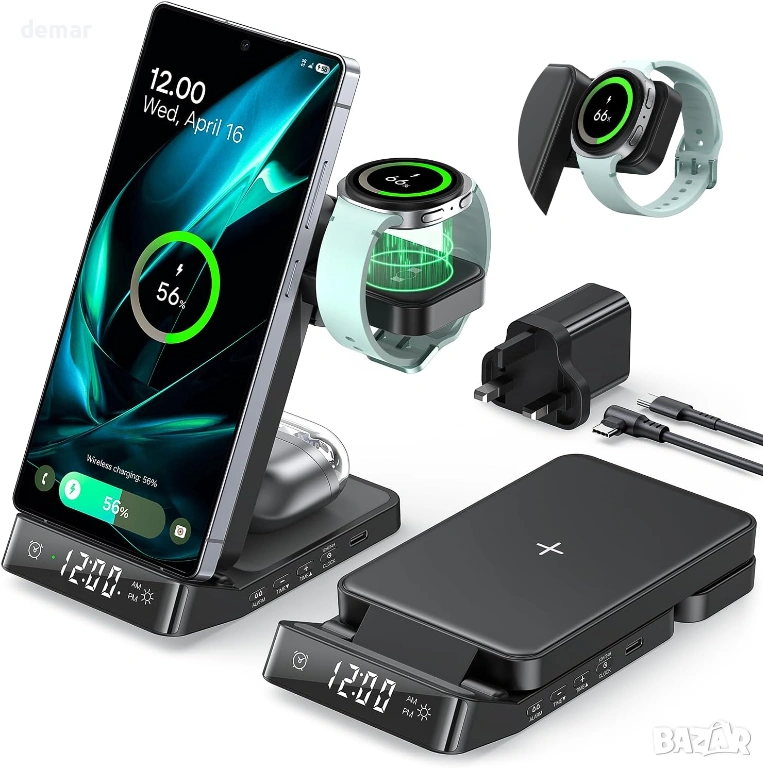 Безжична зарядна станция 3 в 1, предназначена за устройства на Samsung, поддържаща бързо зареждане на телефони Galaxy (до 15W), часовници Galaxy Watches (до 3W) и слушалки Galaxy Buds (до 5W), като същевременно е съвместима и с други телефони и слушалки с Qi технология. Разполага с вграден цифров часовник с аларма, функция за отлагане, регулируема яркост и четири LED режима на осветление. Сгъваемият, удобен за пътуване дизайн се регулира от 0°–65° за гледане на телефона и включва въртяща се на 180° стойка за часовник за вертикално или хоризонтално зареждане, предлагаща стабилна поддръжка за различни видове каишки. Изработена от щадящи кожата материали и противоплъзгащ силикон, тя включва интелигентна защита на чипа срещу прегряване, презареждане, пренапрежение и свръхток за безопасна и надеждна работа. Комплектът включва зарядна станция, 18W адаптер, кабел тип A-C и ръководство за потребителя.