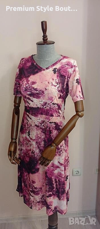Тази елегантна рокля в розово-лилави тонове впечатлява с нежния си флорален принт и женствена визия. Меката линия на облото деколте и класическата дължина под коляното придават изисканост и комфорт, подходящи както за ежедневието, така и за специални поводи. Изработена от лека и приятна на допир материя, роклята подчертава силуета, без да ограничава движението. Романтична, стилна и винаги актуална.