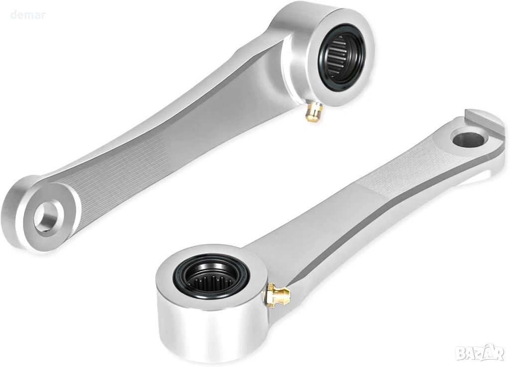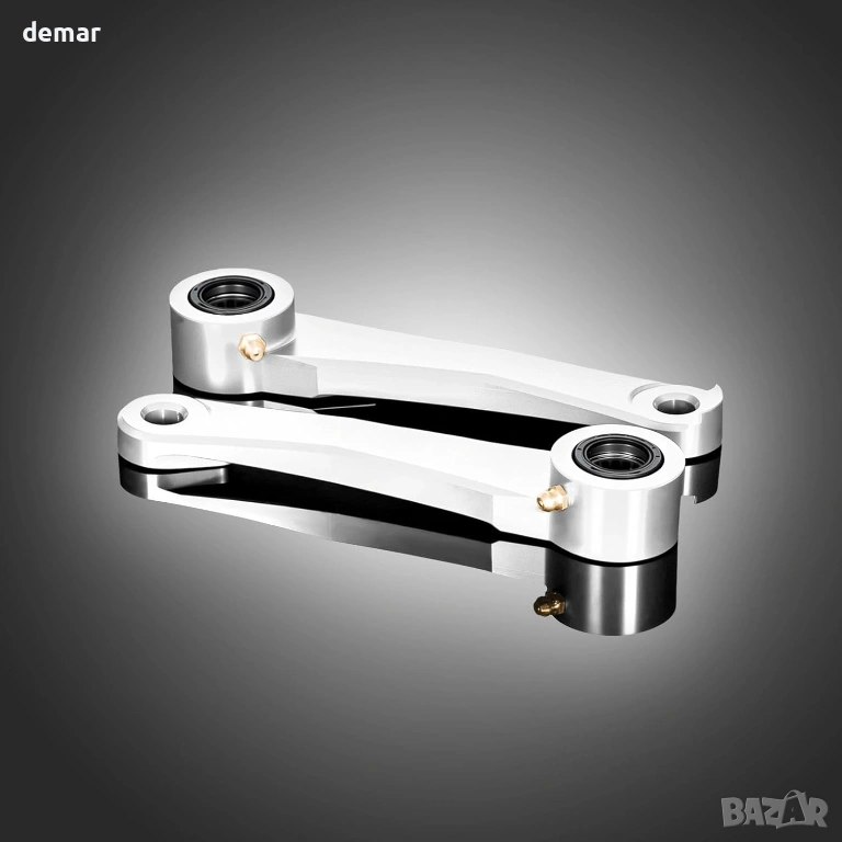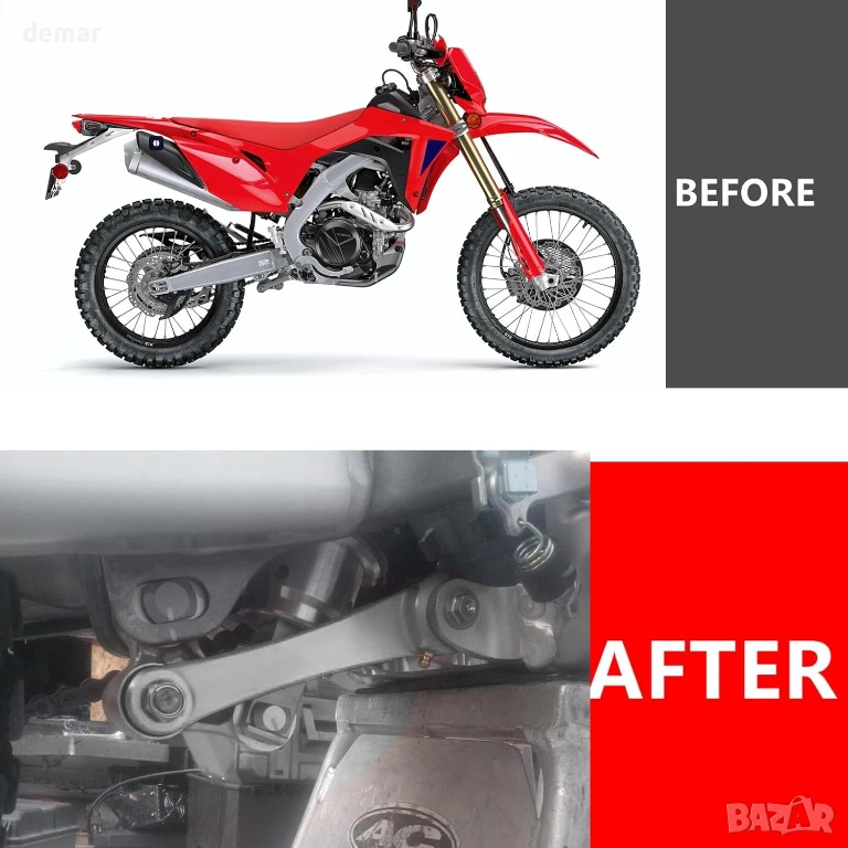 Прецизно проектирана понижаваща рама, специално проектирана за избрани модели CRF450 и CRF250 (2017–2024), осигуряваща точен монтаж и лесен монтаж. Осигурява понижаване на задното окачване с приблизително 2,5 см или 3,8 см (в зависимост от модела), за да осигури по-стабилна и уверена позиция при каране. Изработена от високоякостен авиационен алуминий 7075-T6 за изключителна издръжливост, като същевременно остава лека. Разполага с прецизна CNC обработка и устойчиво на корозия анодизирано сребристо покритие за дълготрайна работа. Доставя се с предварително монтирани лагери и първокласни маслени уплътнения за подобряване на износоустойчивостта и дълготрайността. Проектирана за безразрушителен монтаж без необходимост от специални инструменти, въпреки че настройките на окачването трябва да се регулират след монтажа, за да се поддържа оптимално управление и производителност.