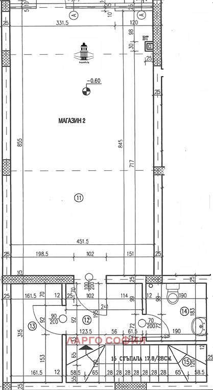 Имотът се състои от магазин, разположен на Партерно ниво, в която квадратура са включени малък коридор, стълбище и тоалетна. На ниво -1 са разположени едно огромно складово пространство (57 кв.м.), с отделни антре, второ складче и стълбище (за магазина на Партера). Общо квадратура: 185 кв.м.