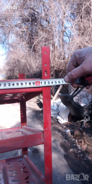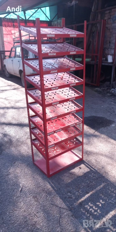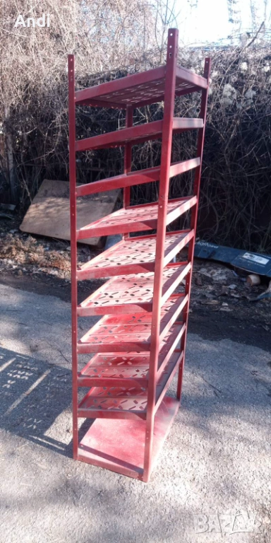 Продавам Метален стелаж с рафтове и колела, височина 160 см. Стелажа е с 10бр метални рафта с размер 34 /53 см и един плъте най долу , разтояние между рафтовете 12см най долу е 25см. Метала е боядисан прахово в червено стилажа като цяло е здрав в добро състояние.