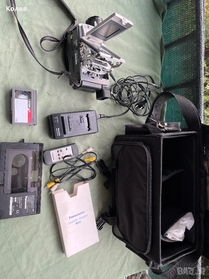 Камера с касетка, батерия , зарядно и всички кабели в чанта. Работи без проблеми.