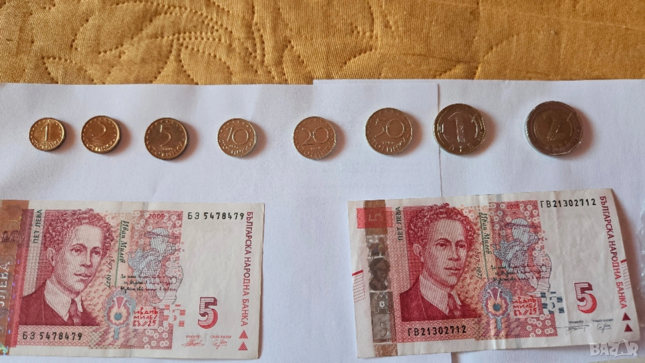 Предлагам лотове български банкноти с номинал банкноти от 5 лева, 10 лева, 20 лева, 50 лева и 100 лева. В зависимост от състоянието на банкнотите ( със следи от прегъване или износване) лота може да го дам и на цена до 120€ за най-лошите банкноти). Предлагам и само банкнота от 100лв. или други, като цената им варира от състоянието. Имам нови и други доста запазени, различни емисии. Предлагам и лотове монети от 1 стотинка до 2 лева.