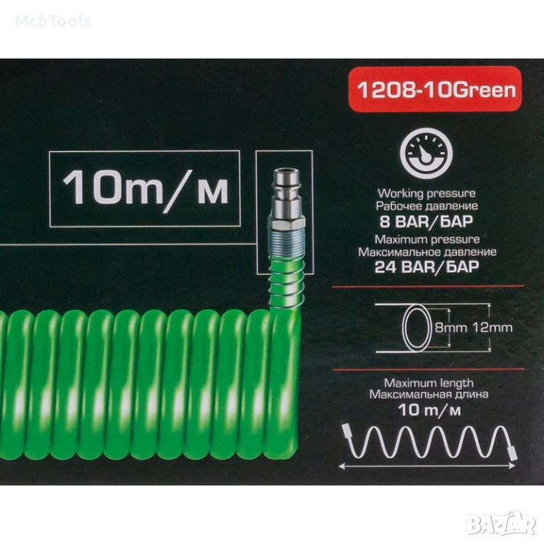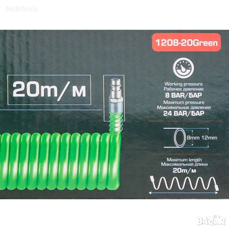Спирален, пневматичен маркуч необходим за работа с всеки компресор. Оборудван с бързи съединители, към него може да се свърже всяко пневматично устройство.