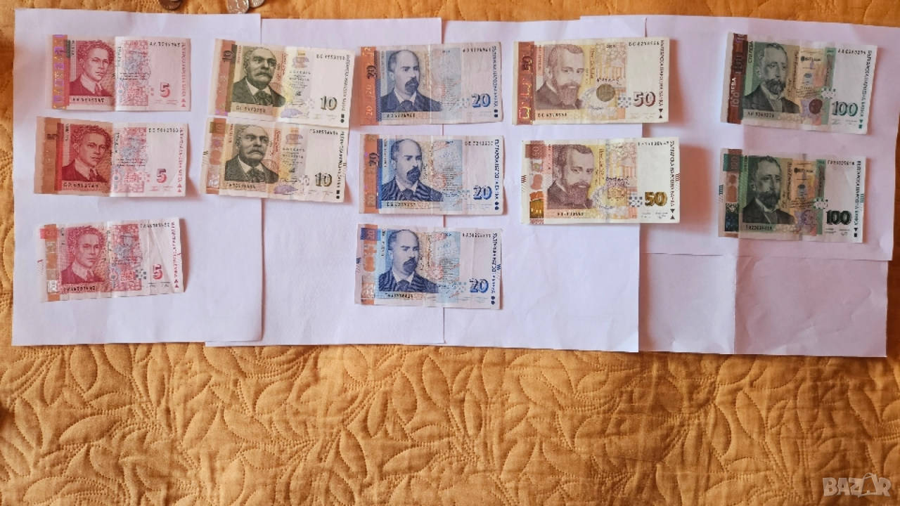 Предлагам лотове български банкноти с номинал банкноти от 5 лева, 10 лева, 20 лева, 50 лева и 100 лева. В зависимост от състоянието на банкнотите ( със следи от прегъване или износване) лота може да го дам и на цена до 120€ за най-лошите банкноти). Предлагам и само банкнота от 100лв. или други, като цената им варира от състоянието. Имам нови и други доста запазени, различни емисии. Предлагам и лотове монети от 1 стотинка до 2 лева.