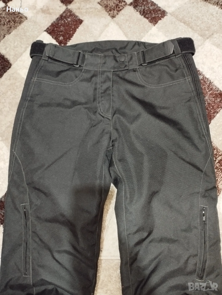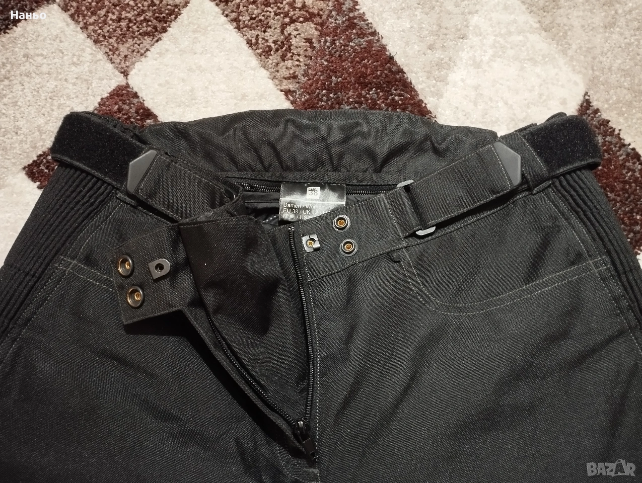 Текстилен панталон неразличим от нов.Има протектори на колената и хълбока,подплата която се сваля.Има ципове за вентилация.Размер-38,Талия-40см едностранно!В кръста може да се регулира с лепенки.