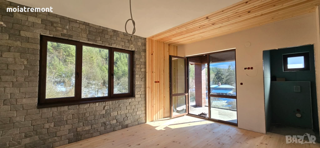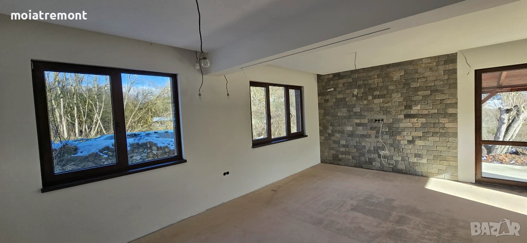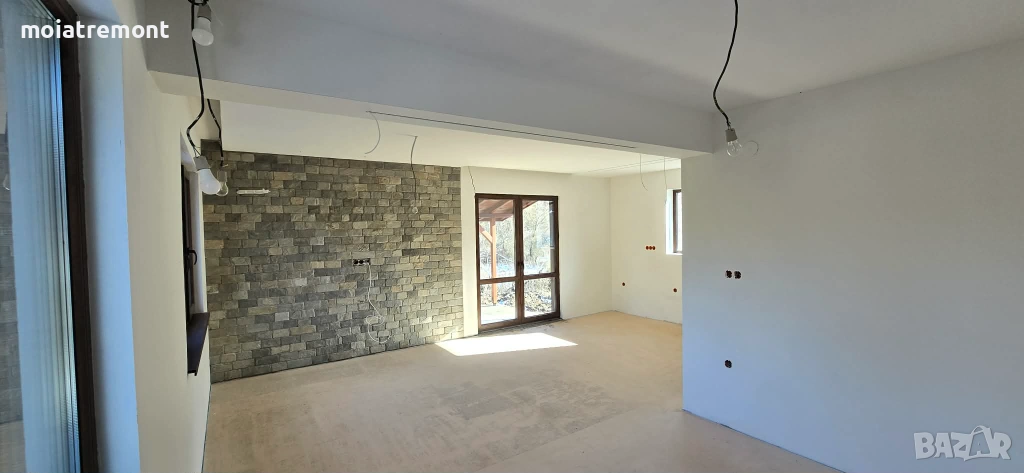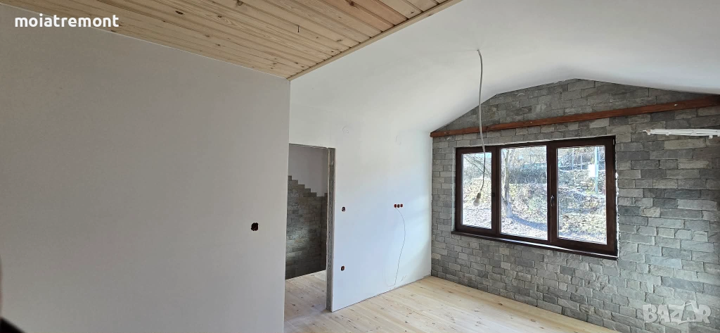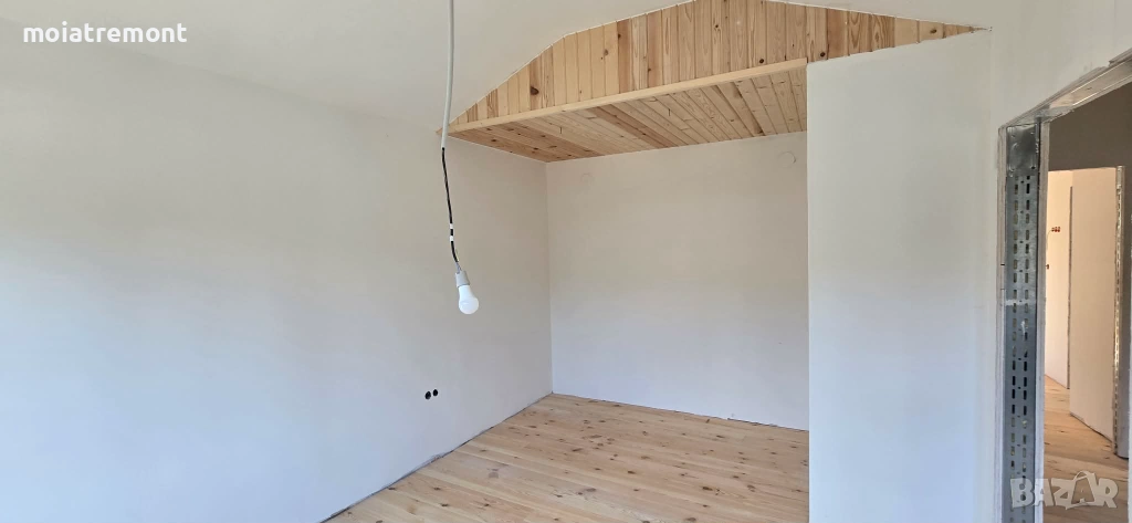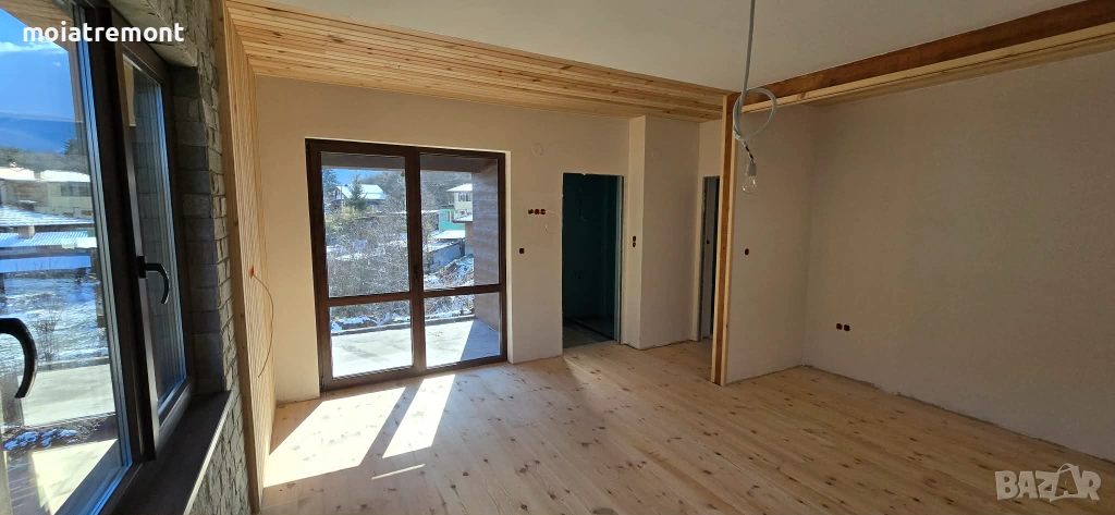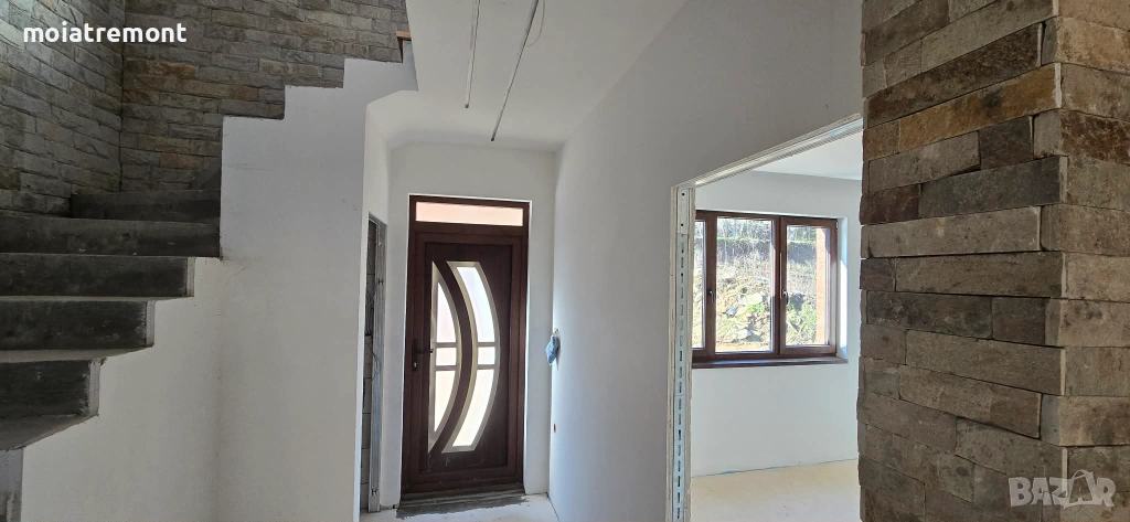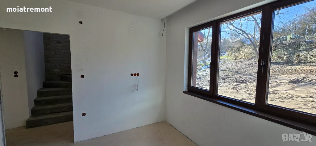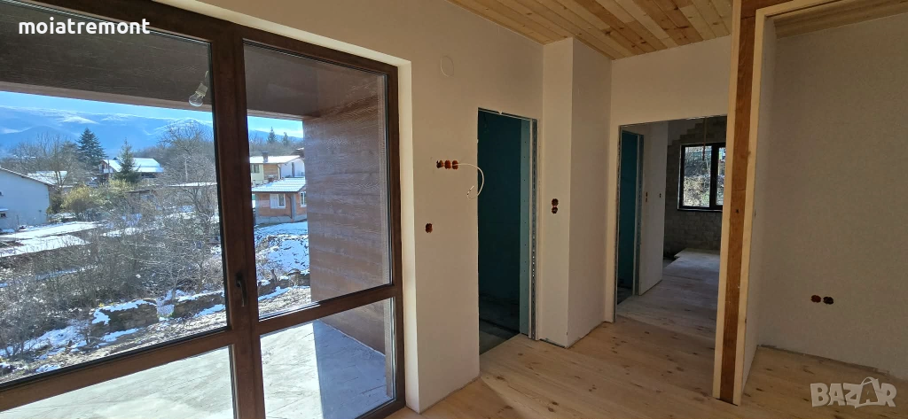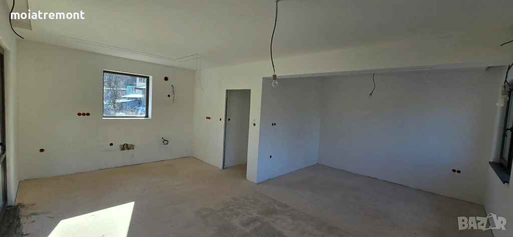 покрива.Незавършените стени са на фина шпакловка, а баните готови за лепене на