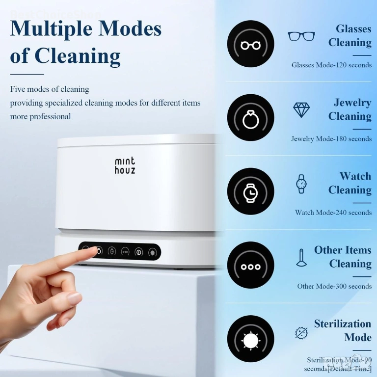 5 режима на почистване. За различни предмети и различни ситуации, тази ултразвукова почистваща машина може да ви осигури различни специализирани режими на почистване, включително очила, бижута, часовници и дори ежедневни предмети.