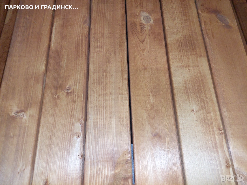 Масивни,здрави,краката на масата са от профил 80/80 имат и крачета за регулиране на височината,дървените профили са импрегнирани и оцветени в цвят кестен,обкова е поцинкован.