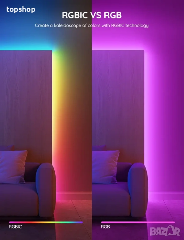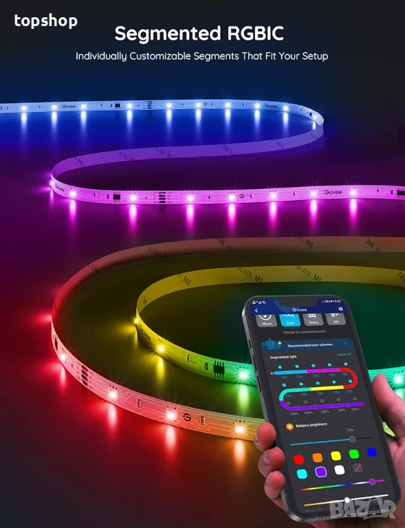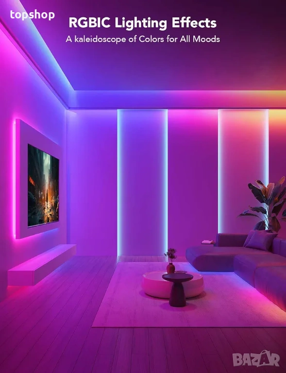 Интелигентни RGBIC ефекти: За разлика от стандартните RGB ленти, RGBIC позволява показването на няколко цвята едновременно на една линия. Това създава плавни преливания и впечатляващи визуални ефекти.