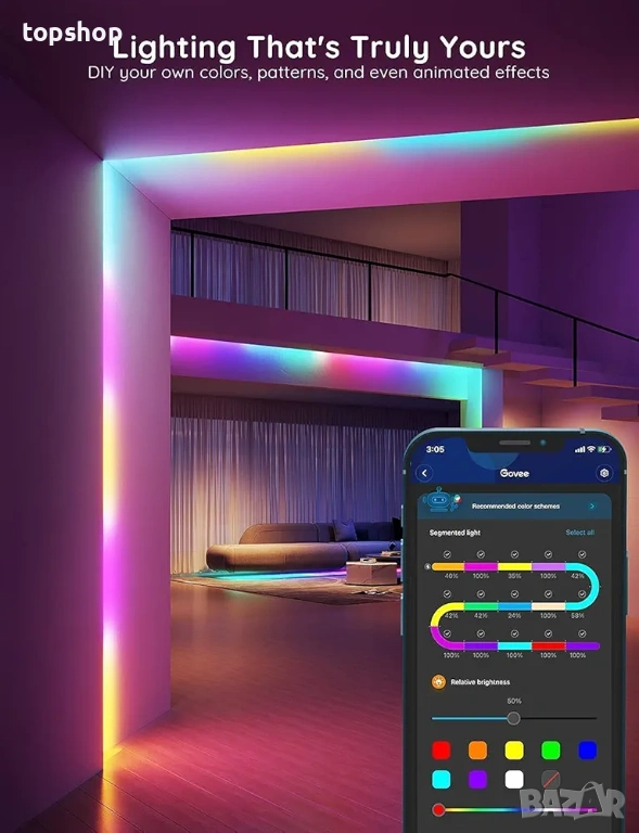 Управление през приложение (Govee Home App): Забравете за обикновените дистанционни. Чрез приложението отключвате пълния потенциал на лентата – регулиране на яркост, избор на цветове и режими директно от вашия смартфон.