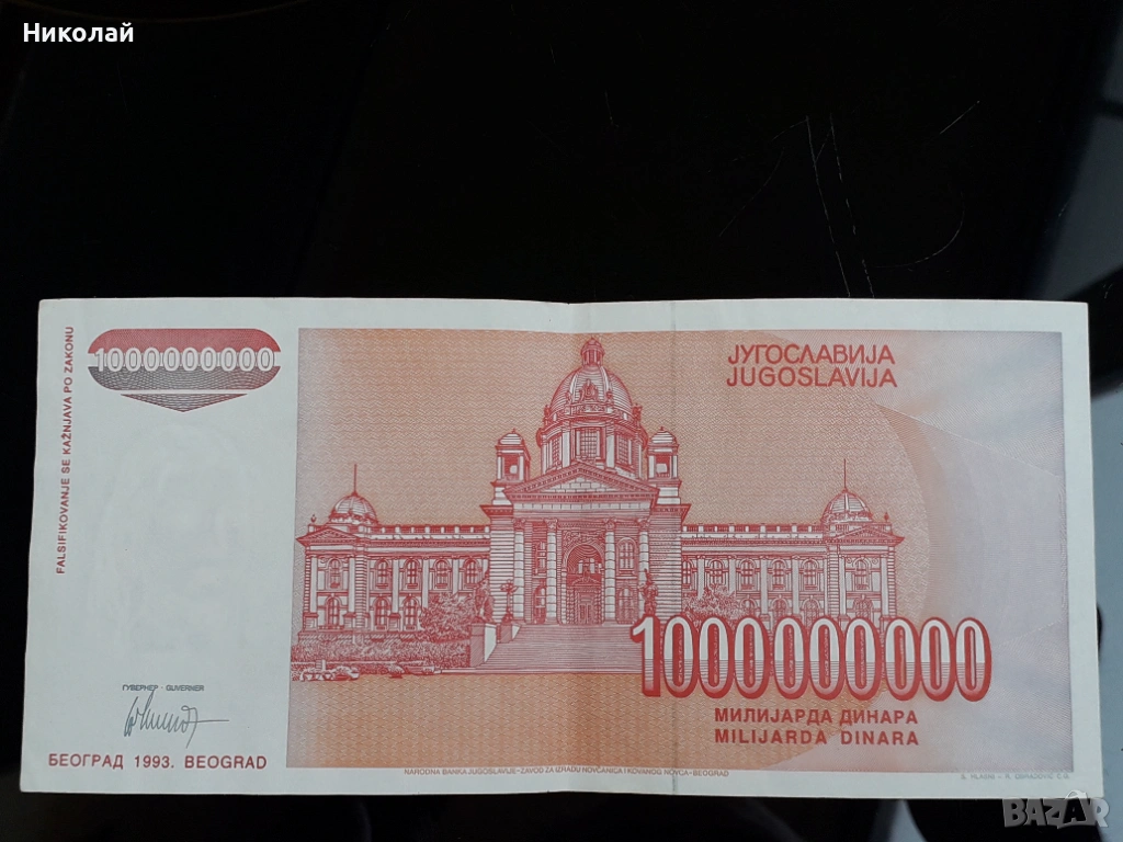 банкнота от 1 000 000 000 динара /един милиярд/ Югославия. → Обява 53658351