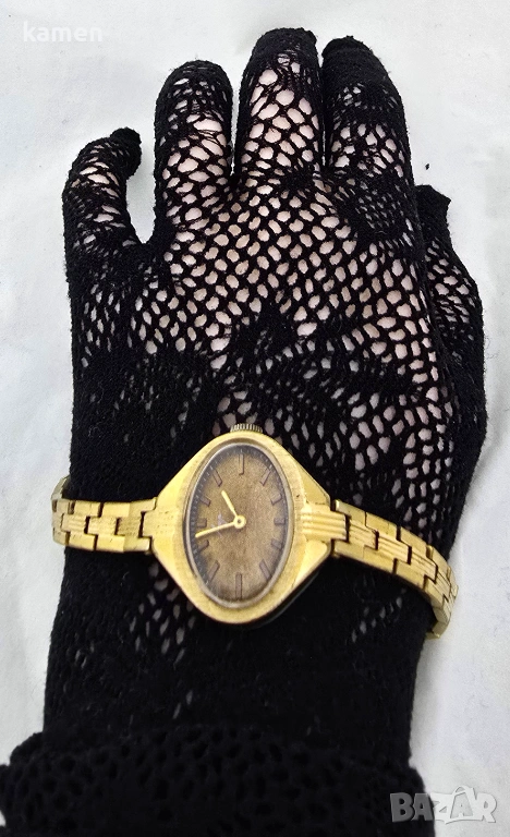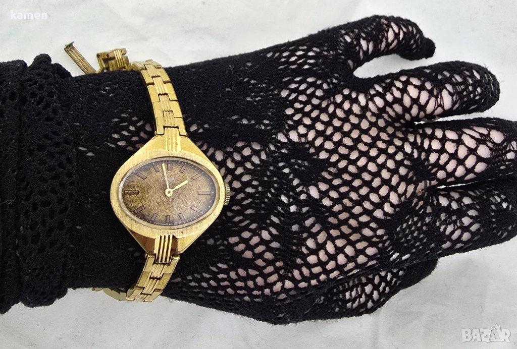 Продава се елегантен винтидж часовник Luch, перфектен пример за дизайн на бижутерски часовници от съветската епоха. Този модел се откроява с уникалната си текстура на циферблата и красиво златно покритие.