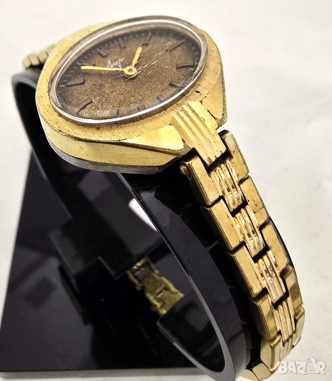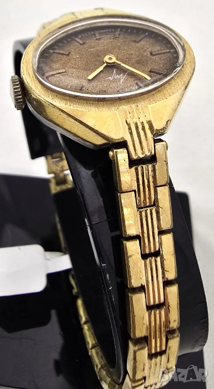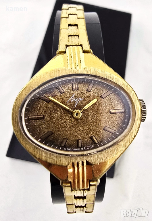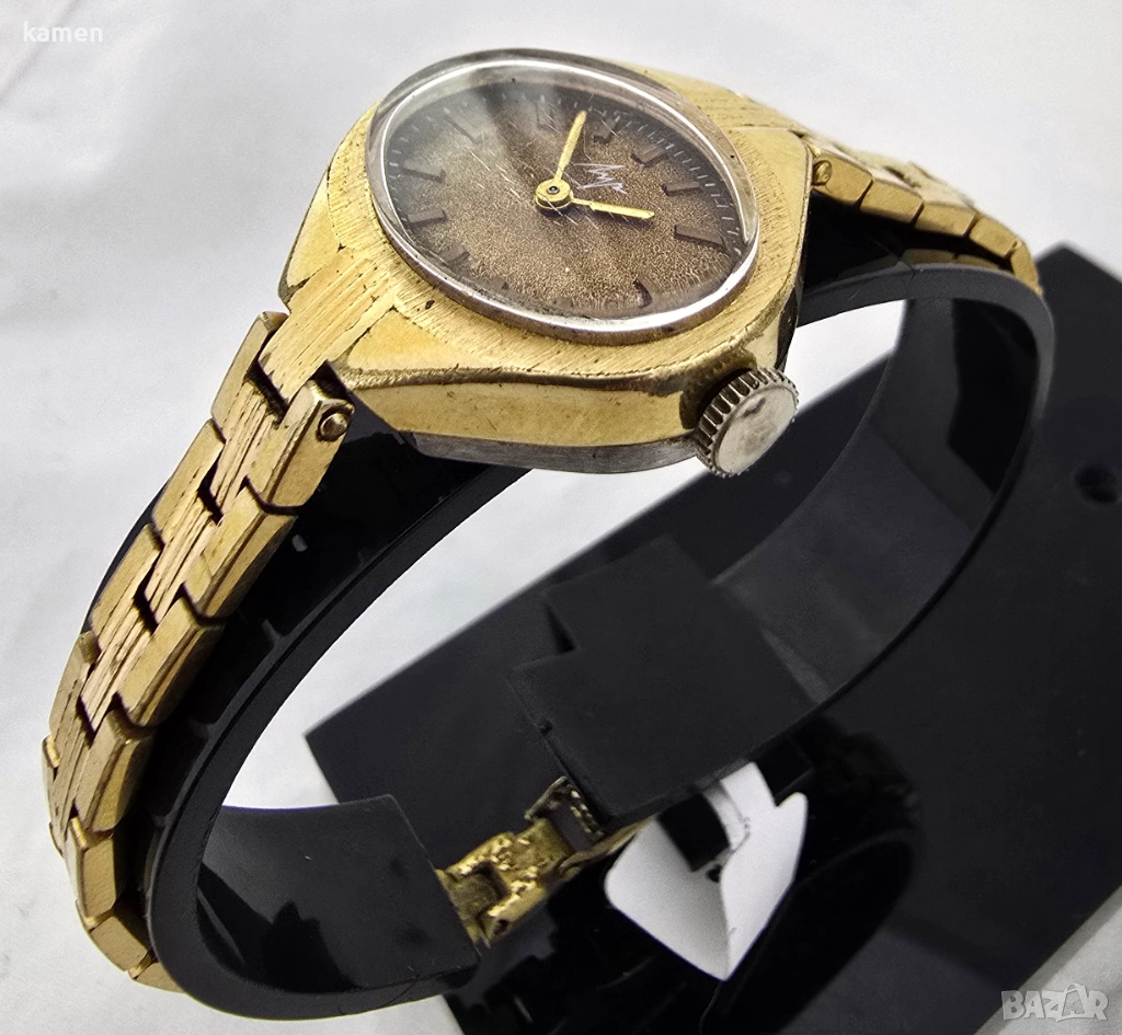 Винтидж съветски дамски часовник LUCH - кал. 1800 - позлатен - текстуриран кафяв циферблат