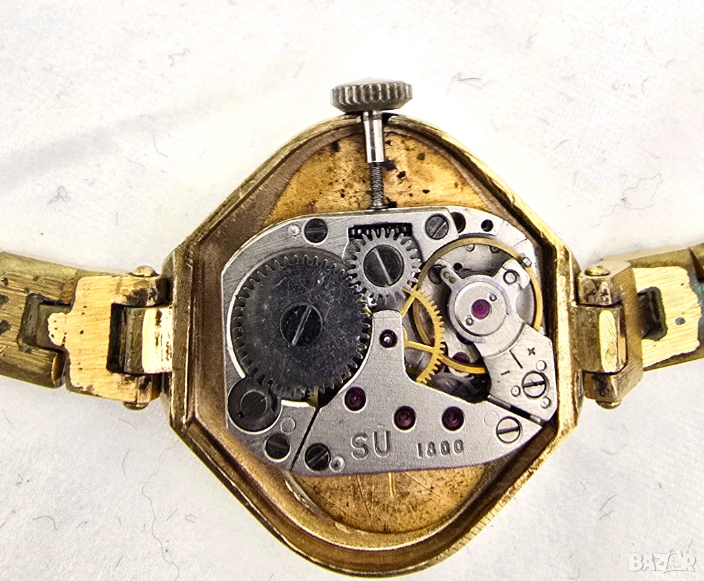 Механизъм: Разполага с надежден ръчно навиващ се калибър 1800, маркиран с SU. Предоставена е снимка на изчистения механизъм.