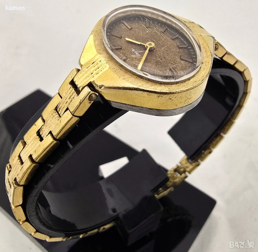 Състояние: Часовникът е в добро винтидж състояние. Позлатяването показва известно износване, което му придава прекрасна автентична патина. Кристалното стъкло е прозрачно с леки следи от употреба.