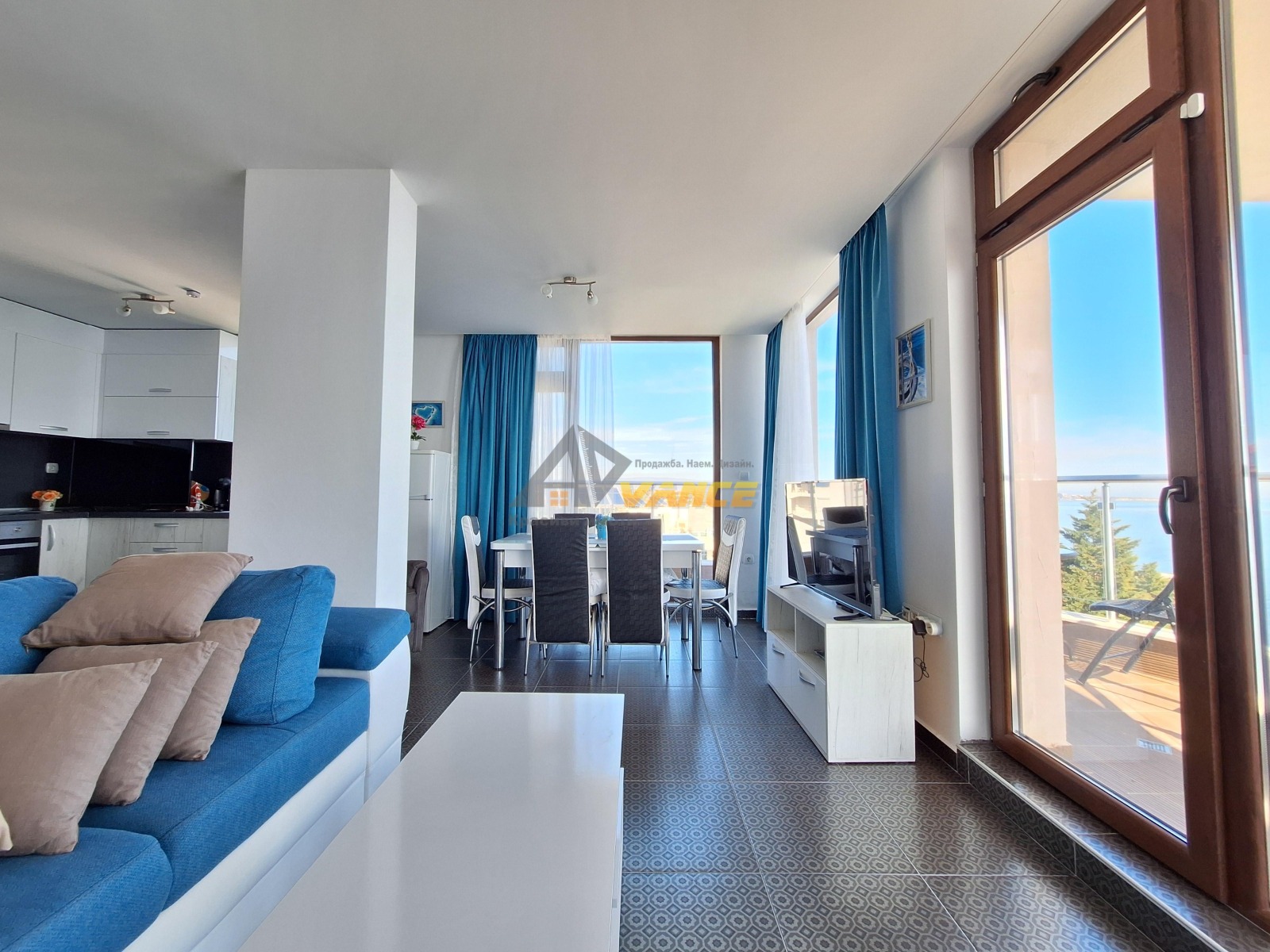 Първо ниво - просторна всекидневна с напълно оборудвана кухня и излаз към тераса с директна панорама към морето.