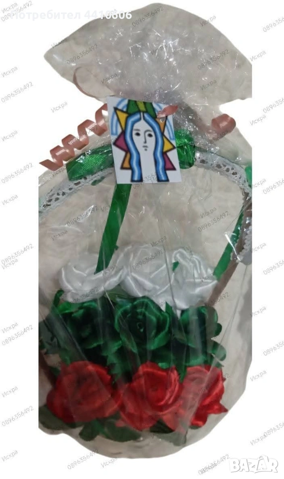 Ръчно изработена кошница с 9 сатенени рози в цветовете на българското знаме → Обява 53658530