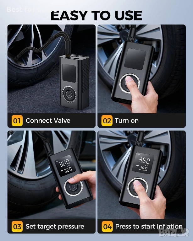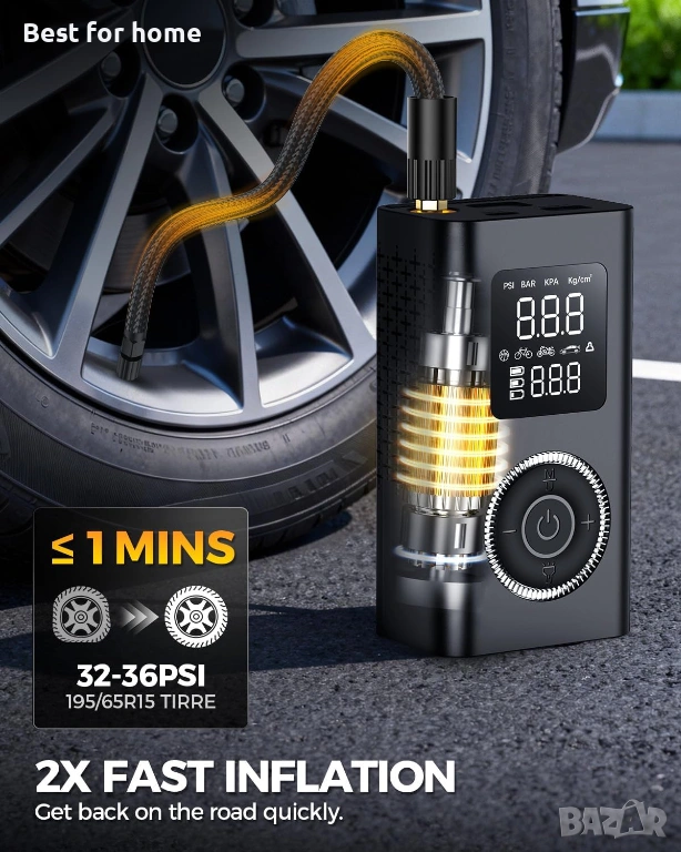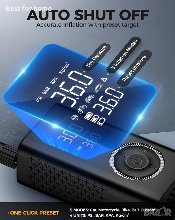 Прецизно напомпване, автоматично спиране: Разполага с 5 предварително зададени режима на напомпване и поддържа 4 единици за налягане, с точност от ±1 PSI. LCD дисплей показва налягането в реално време и се изключва автоматично, когато се достигне предварително зададената стойност, за да се предотврати пренапомпване.