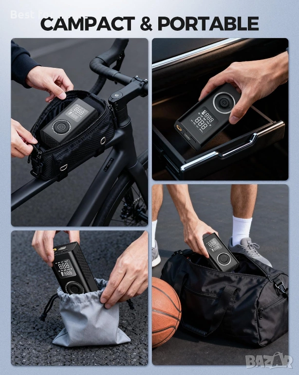 Безжичен дизайн, ефективно напомпване: Оборудван с мощен мотор, той постига максимално налягане от 150 PSI, напомпвайки гума само за минути. Подходящ за автомобили, SUV-ове, мотоциклети и велосипеди, той е изключително издръжлив.