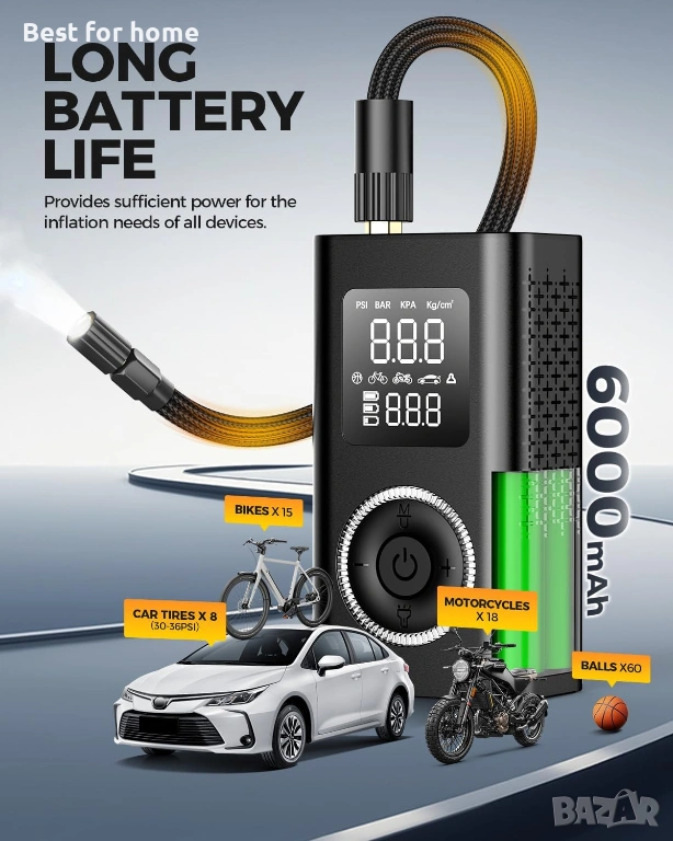 Дълъг живот на батерията: Вградената акумулаторна литиева батерия с капацитет 6000 mAh осигурява достатъчно мощност за ежедневните нужди от напомпване, което позволява употреба по всяко време и навсякъде.