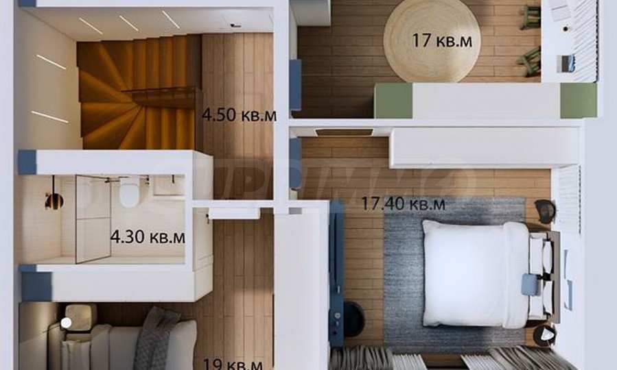 Всяка къща е двуетажна, с функционално вътрешно разпределение и удобно вътрешно стълбище, с обща жилищна площ от 204 кв.м. Сградите са проектирани със скатен покрив с керемиди, който допълва елегантната визия и подчертава усещането за стил и устойчивост във времето.