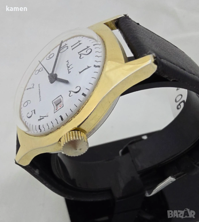 Циферблат: Ясен бял циферблат с елегантни черни арабски цифри и прозорец за дата на 3 часа. Маркиран с "Ruhla" и "Антимагнетичен".