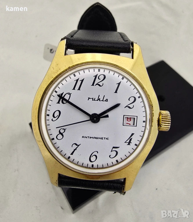 Винтидж антимагнитен часовник RUHLA - произведен в ГДР - позлатен - нова черна каишка
