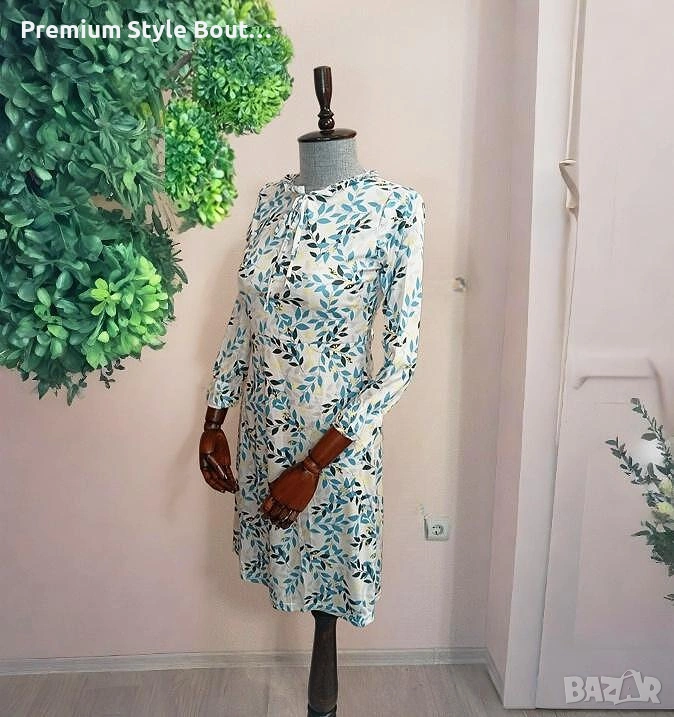 Тази рокля носи свежест и грация с нежния си листен принт в меки синьо-зелени тонове. Идеална за по-хладни дни, благодарение на дългия ръкав. Връзката на деколтето придава допълнителен чар. Подходяща за офиса, срещи и официални поводи