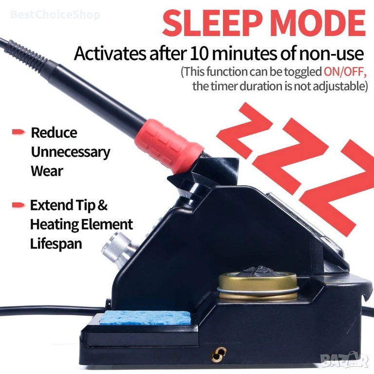 Поялникът преминава в режим на заспиване, когато установи, че не е бил използван за период, по-дълъг от зададената продължителност (продължителността на таймера е регулируема 5/10/30 / OFF).