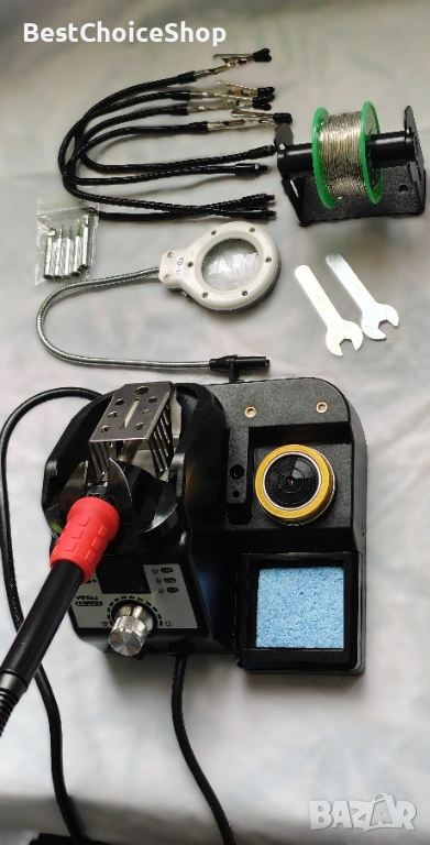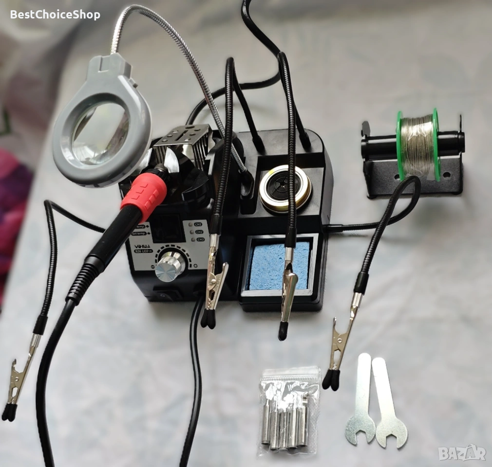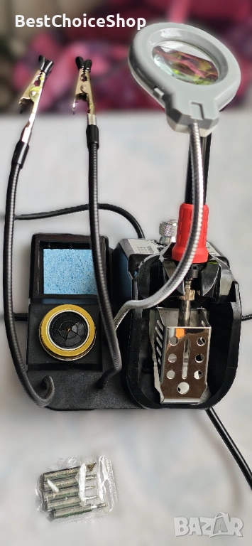 Станция за запояване три помощни щипки тип трета ръка, стойка за тинол и лупа с LED подсветка за допълнително улеснение при работа.