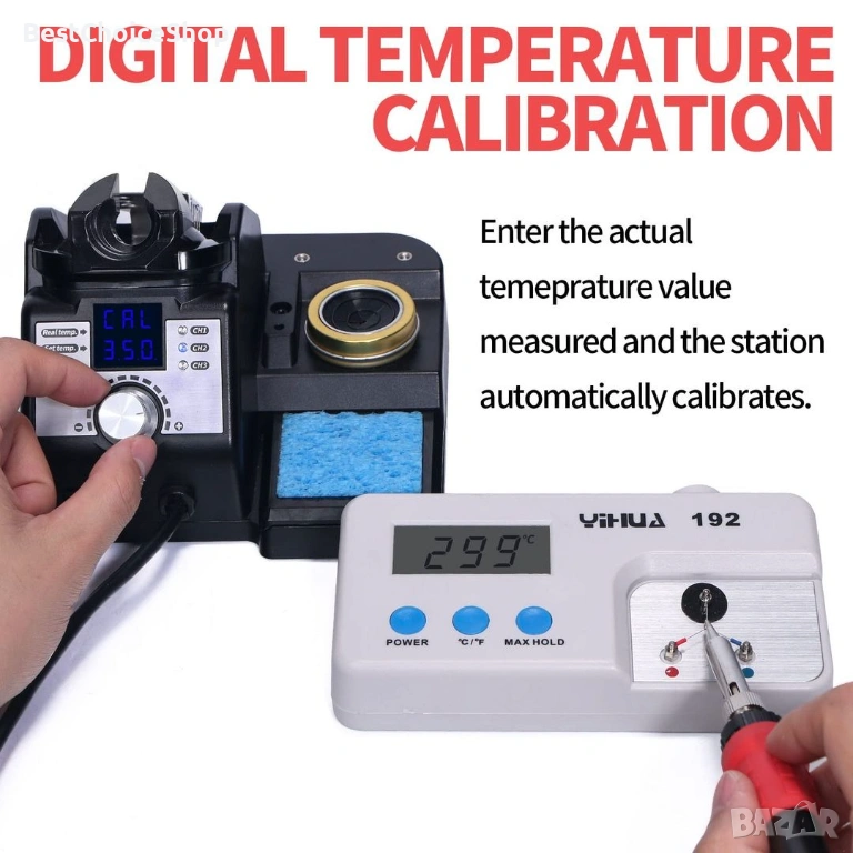 Станцията разполага с функция за цифрово калибриране на температурата, което Ви позволява да коригирате температурните несъответствия, като просто въведете действителната измерена температура на върха на човката.