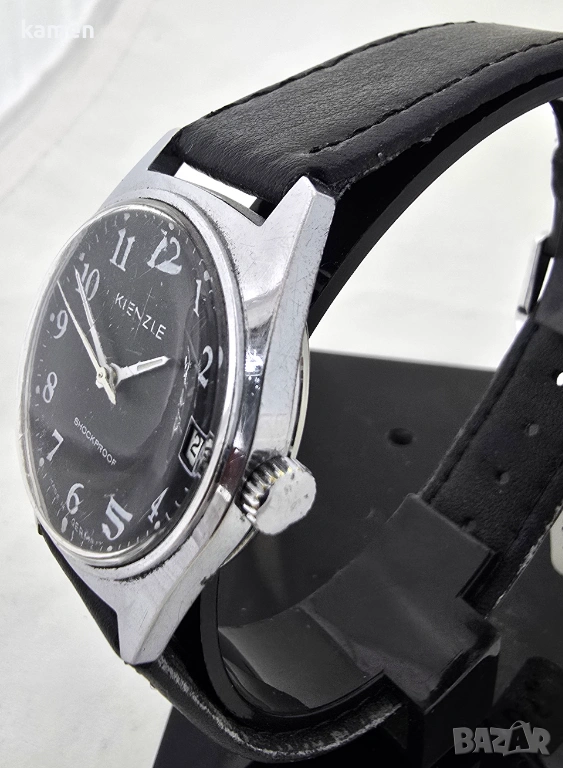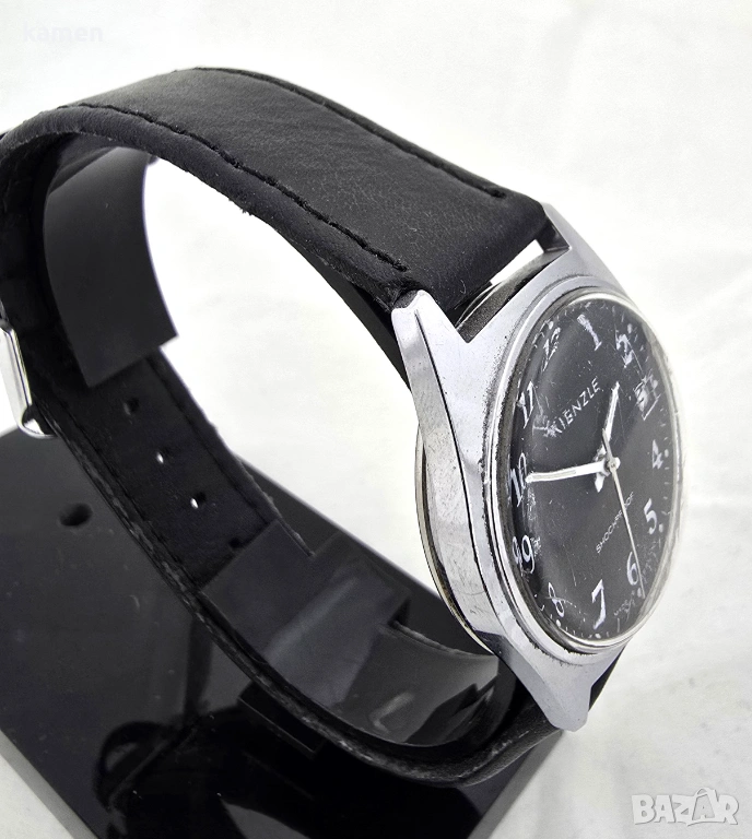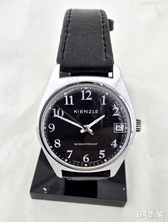 Циферблат: Наситено черен циферблат с надписи "Kienzle", "Удароустойчив" и "Произведено в Германия".