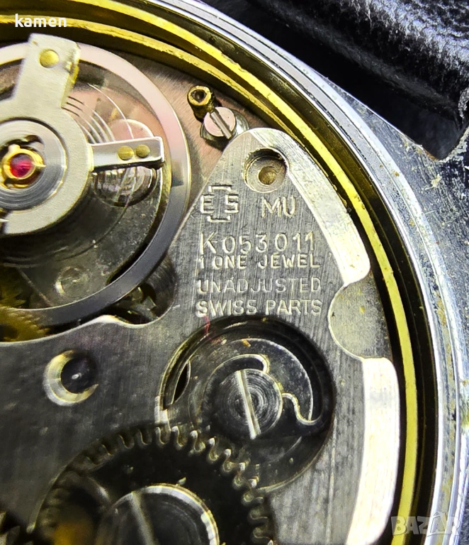 Механизъм: Необичаен ръчен механизъм с маркировка "Swiss Parts" и "One Jewel". Чудесен артикул за колекционери, показващ сътрудничеството между немския дизайн и швейцарските компоненти.