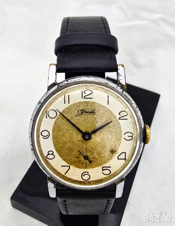Продава се класически механичен часовник от ерата на Съветския съюз, произведен във фабриката Масленников (ZIM). Този часовник се отличава с вечен дизайн с циферблат за под секунда на позиция 6 часа, типичен за часовниците на СССР от средата на века.