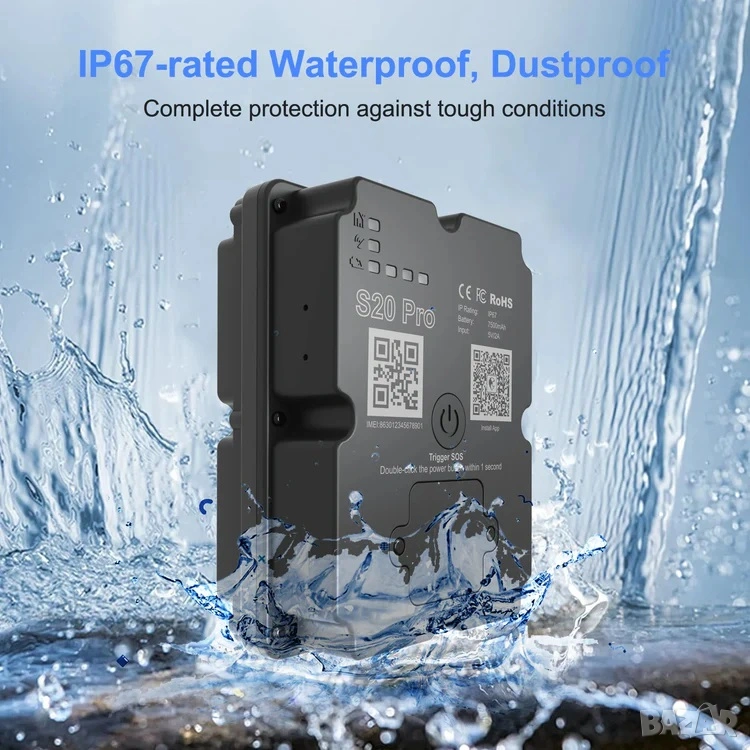 Тракерът е със защита IP67, което означава пълна защита от прах, дъжд и на кратко потапяне във вода.