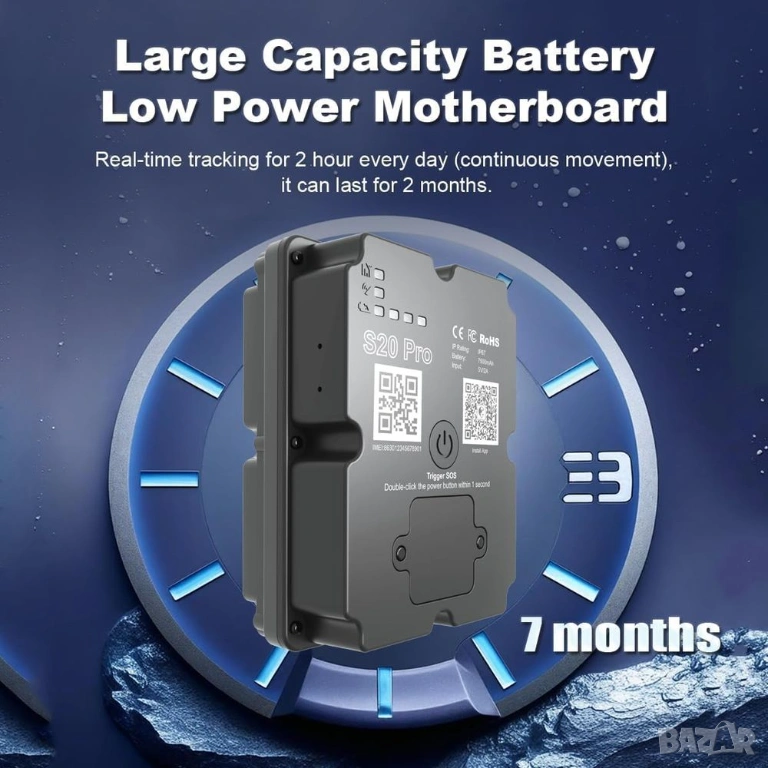 GPS тракерът е оборудван с изключително мощна 7500mAh батерия, оптимизирана за работа с 4G мрежи.
