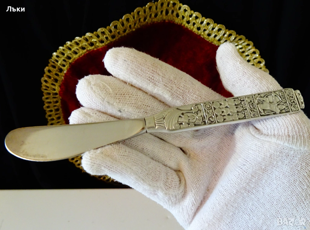 дебело хромирано.Дръжката е изработена от 95% калай и 5% сребро,декорирана с