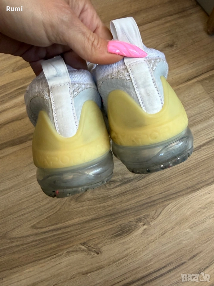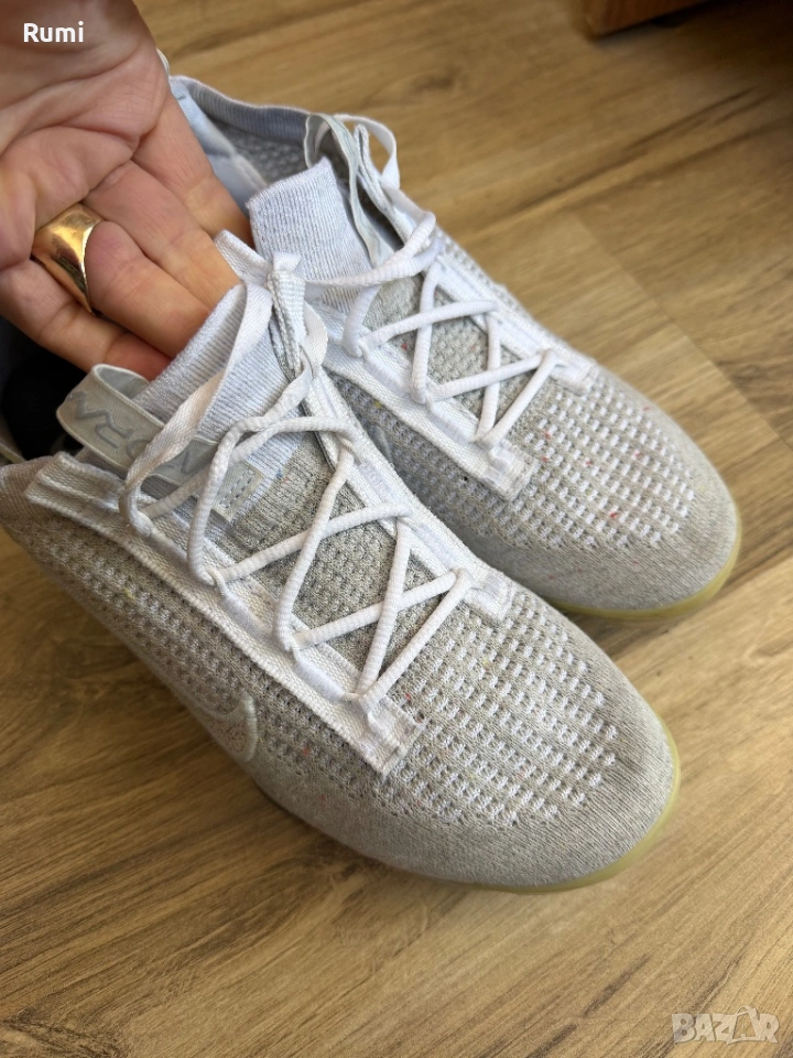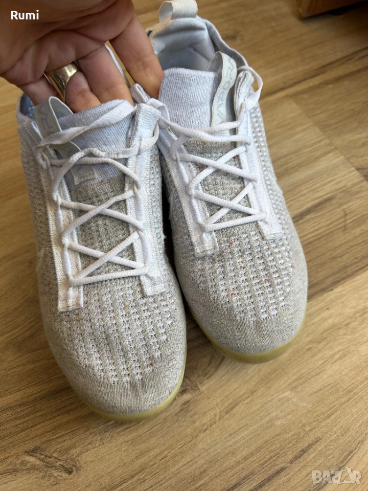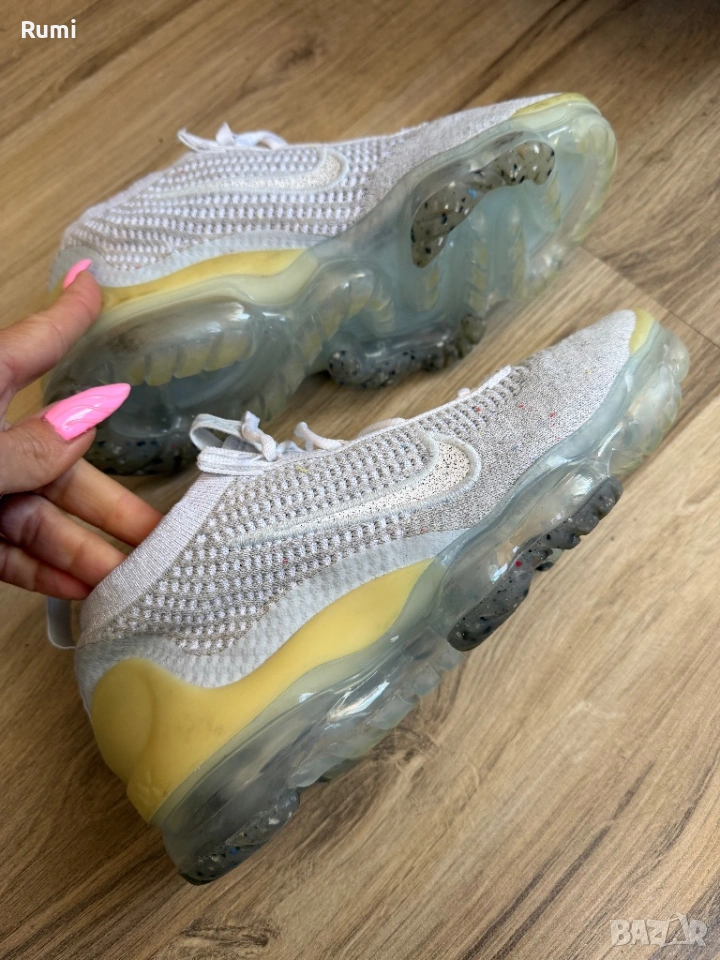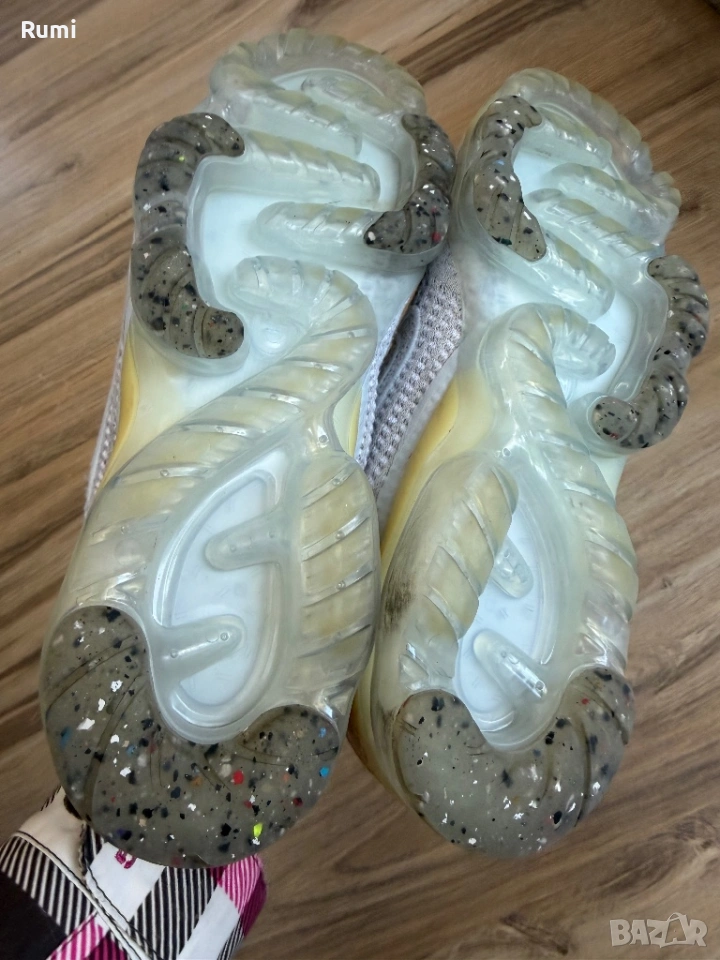 Аеродинамичната и наподобяваща чорап горна част е покрита с тъкан Pure Platinum Flyknit. Допълващите се бели лого Swoosh от медиалната и страничната страна на обувката, при по-внимателен поглед, показват петънцата от технологията Grind на Nike. Не само това, Swooshes са очертани и с бяла бродерия. Езичето за дърпане на петата има семпло лого Swoosh, а езичето за дърпане е с логото на Vapormax. Щипката за петата от TPU е полупрозрачна, гумено бяла. Белите лога Pinwheel се открояват върху петнистите сиви стелки. Един забележителен завършващ детайл на тази обувка е прозрачната балончеста подметка, която разкрива цветни остатъци от материал отдолу. В страхотно състояние на практика нови без следи от носене без забележи стоят страхотно унисекс модел . Като размер са 38,5 н със стелка 24,5 см ! Модела е унисекс !
