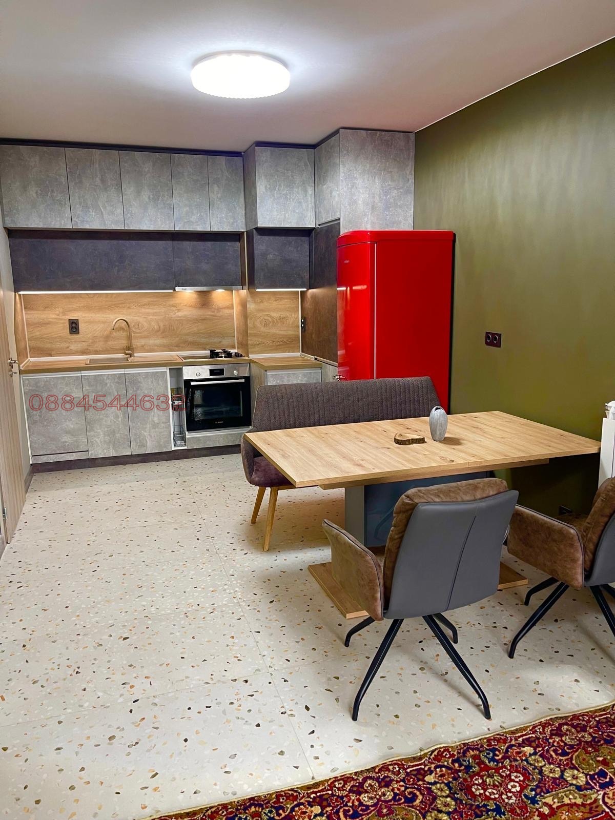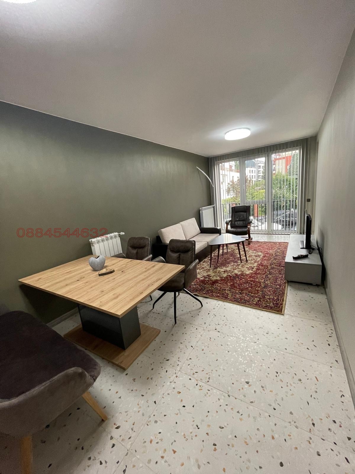 Апартаментът се намира на метростанция Витоша, на метри от Парадайз мол. Нова много добре поддържана сграда, на комуникативно място, лесен достъп за бул.Филип Кутев и за бул.Черни връх. Жилището е с изцяло южно изложение и ниски сметки за отопление. Има климатици във всички стаи, както и парно на газ. Апартаментът се състои от две спални, две бани, всекидневна с кухня, антре, коридор и голяма южна тераса. Напълно обзаведен и оборудван с всичко необходимо за живеене. Към апартамента има и индивидуален двоен подземен гараж с ролетна щора, който може да се ползва срещу допълнително заплащане. Отдава се директно от собственика.