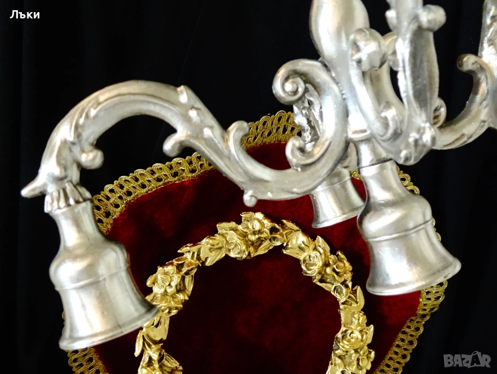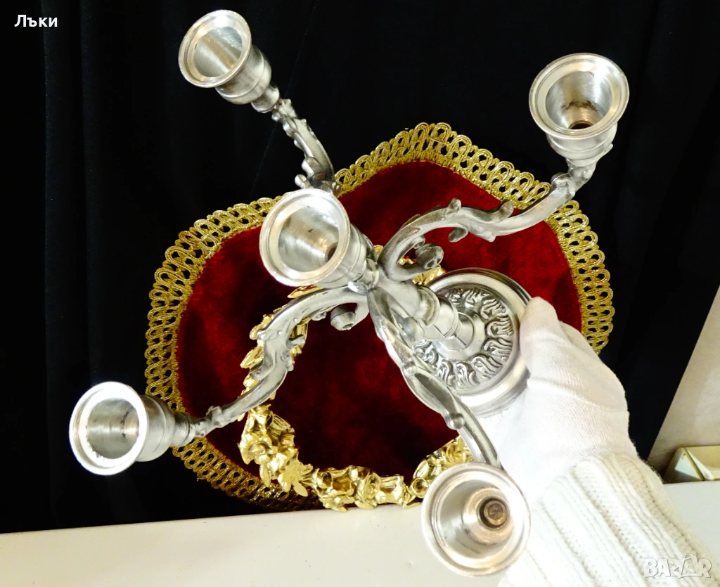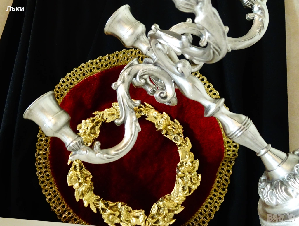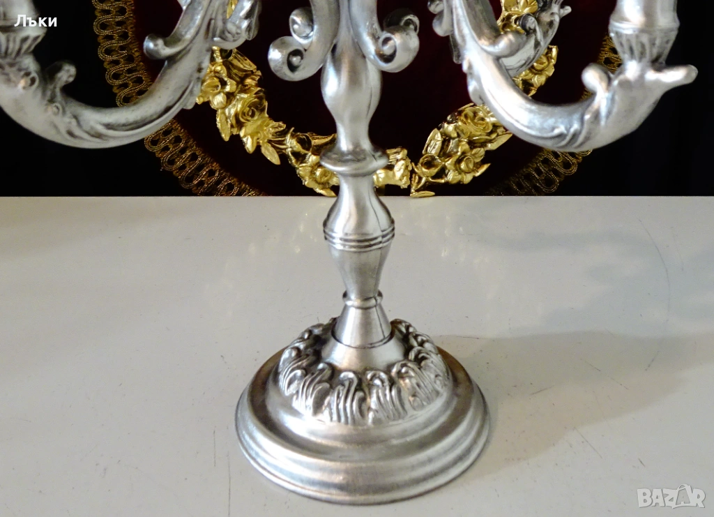 орнаменти,свещника блести като сребърен.Ръчно отлят,изключително