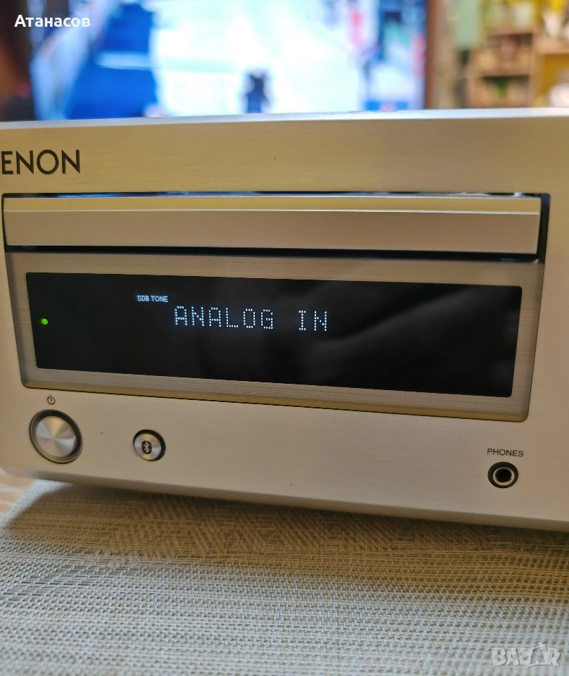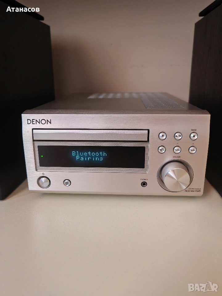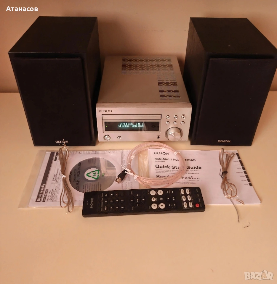 Микро Hi-Fi система Denon RCD-M41DAB + Тонколони SC-M41 | Bluetooth & DAB+ ​ Продавам запазена микро Hi-Fi система Denon RCD-M41DAB в цвят Premium Silver, в комплект с оригиналните тонколони SC-M41. Системата е носител на множество награди (What Hi-Fi?) и предлага качество на звука, което конкурира много по-големи и скъпи компоненти. ​Основни характеристики: ​Звук: Изключително чист и детайлен звук с мощност 2 Х 30W. ​Свързаност: Вграден Bluetooth за стрийминг от телефон/лаптоп (с опция за изключване за по-добър звук от CD). ​Радио: DAB/DAB+ и FM тунер. ​Входове: 2 оптични входа (идеална за свързване към телевизор или конзола) и аналогов вход. ​CD плеър: Чете безпроблемно оригинални и записвани дискове. ​Изход за субуфер: Ако искате още по-плътен бас. ​Състояние: Визуално и технически изглежда много добре (има леки забележки по капака-видно на снимките) . Използвана е внимателно в домашна среда. Комплектът включва: Ресивър, 2 бр. тонколони, оригинално дистанционно, захранващ кабел, FM/DAB антена, кабели за тонколоните и CD с книжка за инструкция. ​ Може да се види и тества на място.