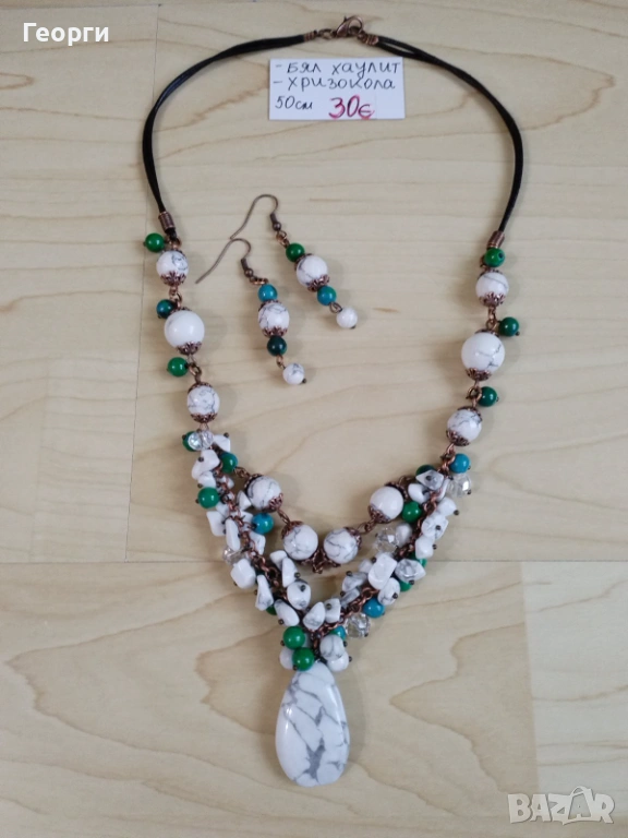 Стилно дамско колие от бял хаулит и хризокола в нежна цветова комбинация, завършено с ефектна висулка. Ръчно изработено бижу, което съчетава елегантност и естествена красота и подчертава индивидуалния стил.