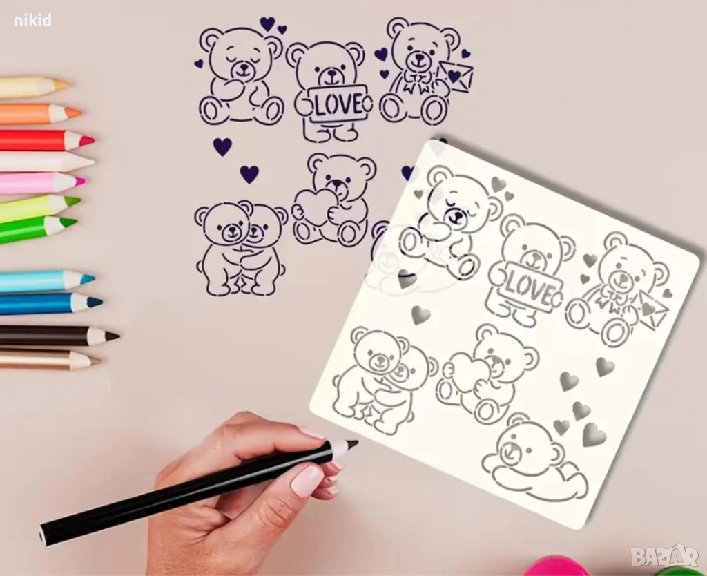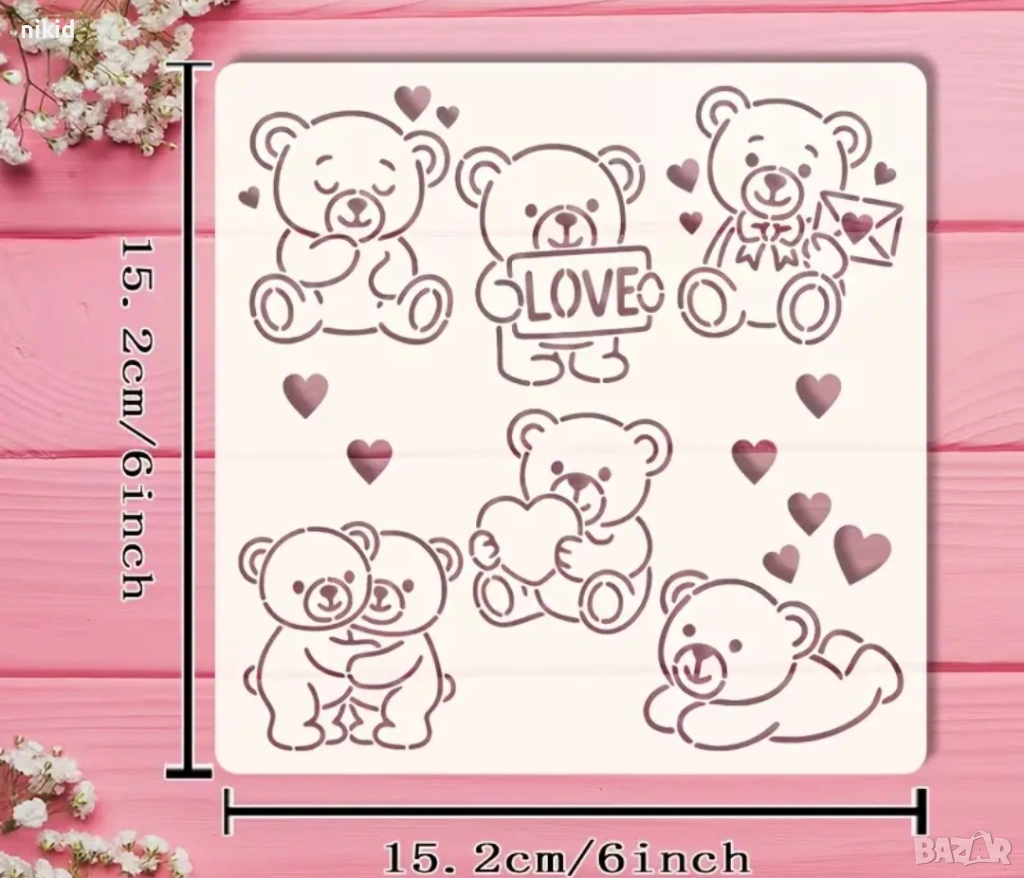 Мече Мечета Love стенсил шаблон спрей торта украса сладки Scrapbooking → Обява 53661701