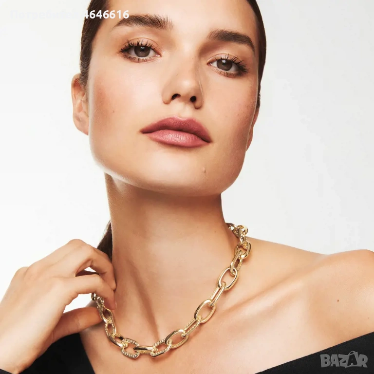 Дръзко, впечатляващо колие, изработено със златисти и блестящи акценти. Вдъхновено от емблематични модни тенденции, то добавя драматизъм и финес към всеки тоалет.