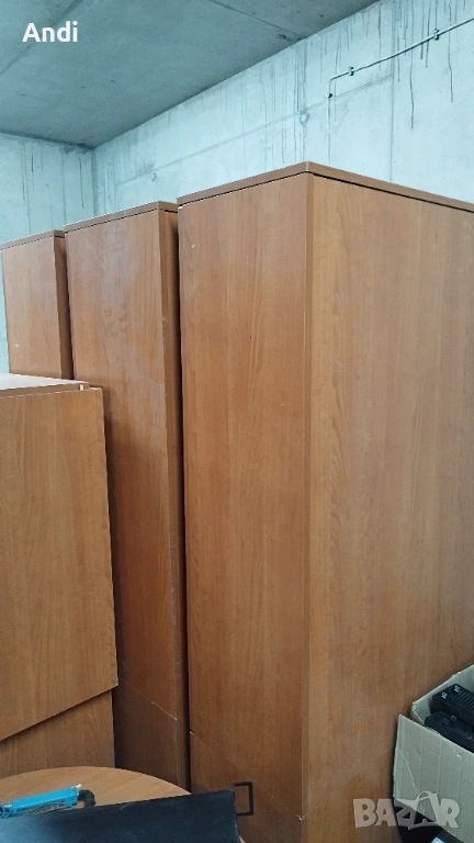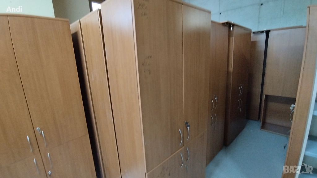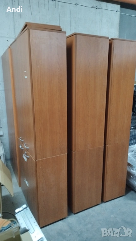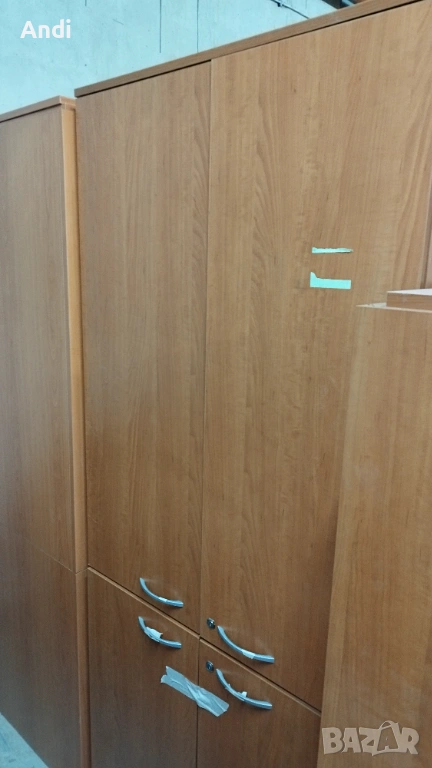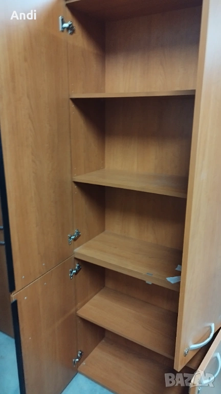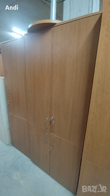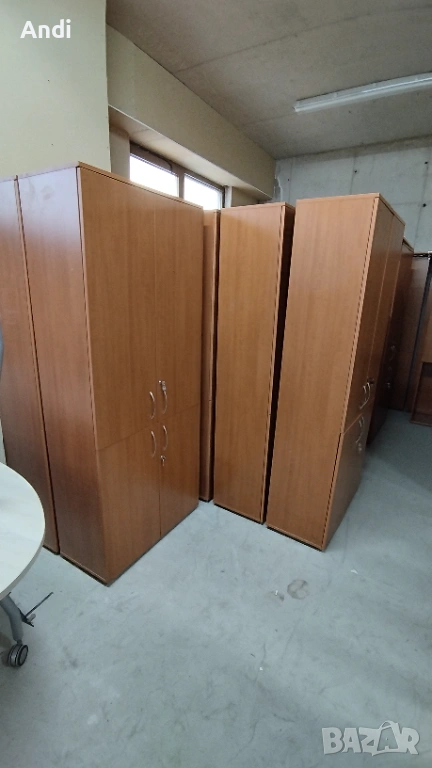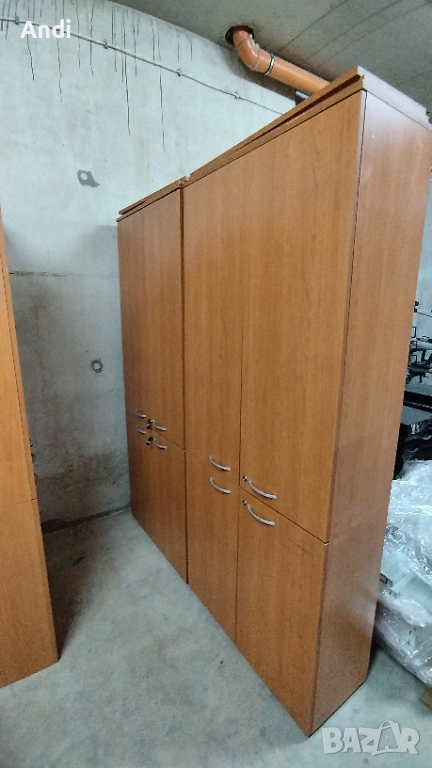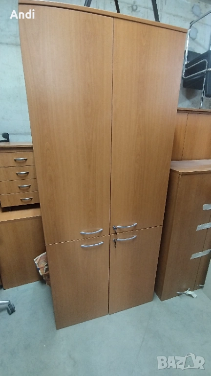 Продавам Двукрил гардероб с четири врати - Офис шкаф с рафтове ширина 86/ дълбочина 42/ височина 205см. Шкафа е в отлично състояние почти като нов братите се заключват. Материала е ПДЧ а цвета е череша. Имам 6 броя. Цената от 130€ е за брой