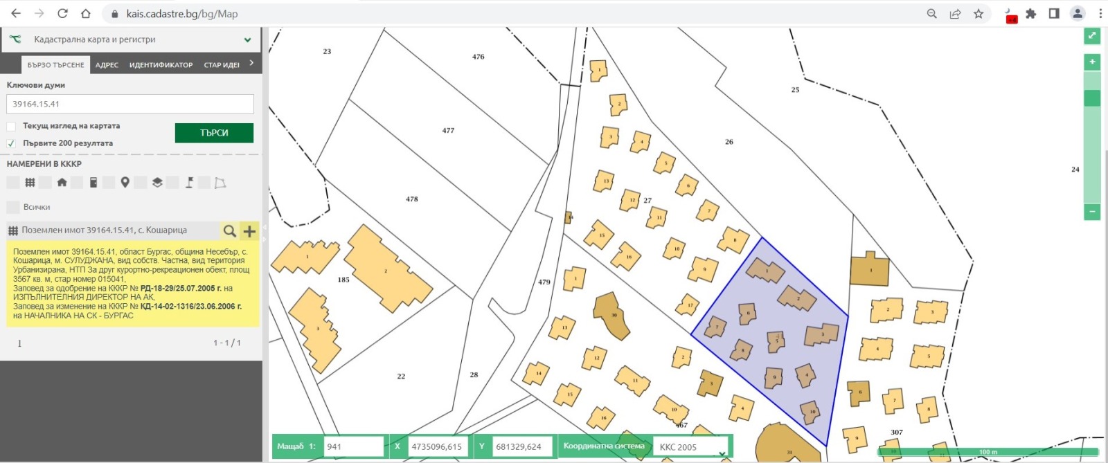 В ПИ 39164.15.27 има незастроен участък с възможност за изграждане на триетажна еднофамилна къща - Нина със ЗП 70 кв.м. и РЗП 200 кв.м. прилагам пълна техническа документация. Земята е върху южния склон в подножието на Стара планина в екологично чиста и защитена зона, предвидена за инвестиционни проекти и изграждане на курортно - рекреационни обекти на около 5 километра от Свети Влас и Слънчев бряг. Гледката е фантастична - панорамна към море, планина с гора и долини. Поради уникално си местоположение - планина, гора и море, климата е морски и подбалкански, мек като целогодишно въздуха е изключително чист и свеж. В района целогодишно е изключително тихо и спокойно, има изградени множество екопътеки за туризъм, ловни стопанства. Водата се извлича от сондаж от подножието на планината като в близост е изградена и био-ферма за мед и пчелни продукти. Върху терена има изградени 26 къщи с отстъпено право на строеж, но без права за ползване на земята, както и без право на собственост върху земята от собствениците на сградите. Изградена е инфраструктура - каменни вътрешни алеи с парково осветление и автоматизирана поливна система, богато озеленена храстова и тревна настилка, изключително красиви декоративни и екзотични дървесни видове. Къщите са проектирани в традиционна балканска архитектура като са обособени 70 самостоятелни обекта и 14 басейна. Всяко едно домакинство притежаващо недвижим имот изграден върху терена ще има правото да закупи земя с площ от около 140 кв.м. - идеални части. Върху широка асфалтирана алея има възможност за изграждане на места за паркиране на автомобили, както и инфраструктура за изграждане на зарядни станции за електромобили със соларни навеси над местата за паркиране. Към някои от къщите има изградени и малки басейни до 100 кб.м. които след закупуване на земята от собствениците, могат да се приобщят към къщите посредством изграждане на отопляеми зимни градини - веранди със система от ВЕИ върху покривната част на сградите за подгряване на водата с цел целогодишно ползване на басейните от собствениците. Покупката на идеални части или реално обособени части от земята върху която е построена сградата ще даде пълните права на собственост върху изградена инфраструктура към сградите и придадените части към земята (каменни алеи, електрозахранване, градинско осветление, водоизточници, басейни, места за паркиране на автомобили) както и правата върху трайните насаждения (дървета, храсти, тревни и декоративни растения). Собствениците на идеални части земя придобиват и правото самостоятелно да се грижат и да управляват недвижимите си имоти което в дългосрочен план значително ще повиши тяхната стойност и ликвидност или да се довери охраната, управлението и стопанисването на имота на упълномощено физическо или юридическо лице. С цел защита на юридическия и финансов интерес на собствениците на сгради при покупка на идеални или реални части земя в ПИ с кадастрален индентификатор 39164.15.41 и ПИ 39164.15.27 е препоръчително консултация с озеленител, ландшафтен архитект или независим оценител и както и с юрист специализиран в областта на вещното право на недвижими имоти с цел изграждане на финансова рамка максимално близка до реалната пазарна стойност на земята ведно с изградена инфраструктура към сградите - каменни алеи, електрозахранван