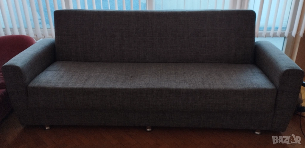 Диван с размери 220 см х 90 см. Облегалката пада и става на спалня. Отдолу има ракла. Дивана има две забелешки на дамаската и в раклата.